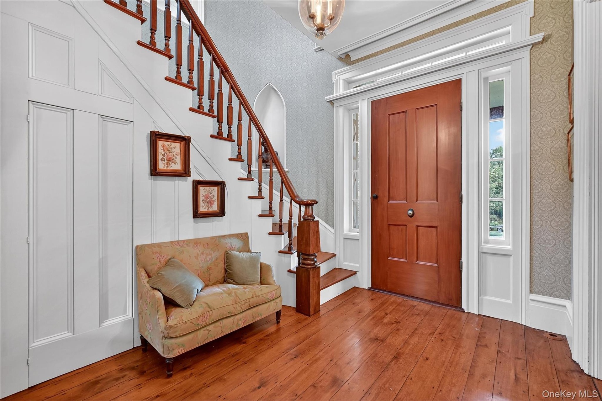 - Step inside to a grand foyer where original wide-plank floors meet a sweeping curved staircase—an architectural centerpiece that sets the tone for tim