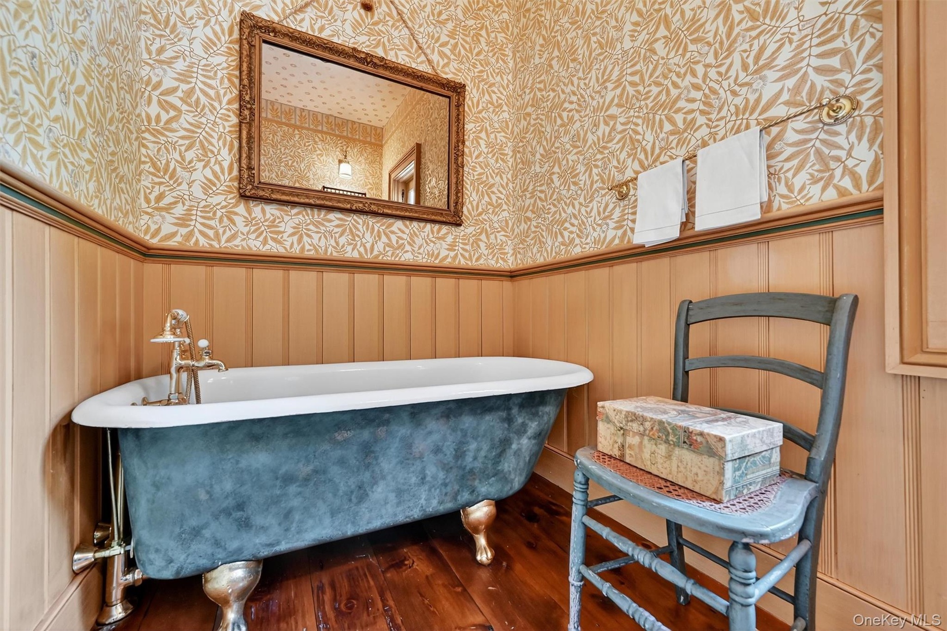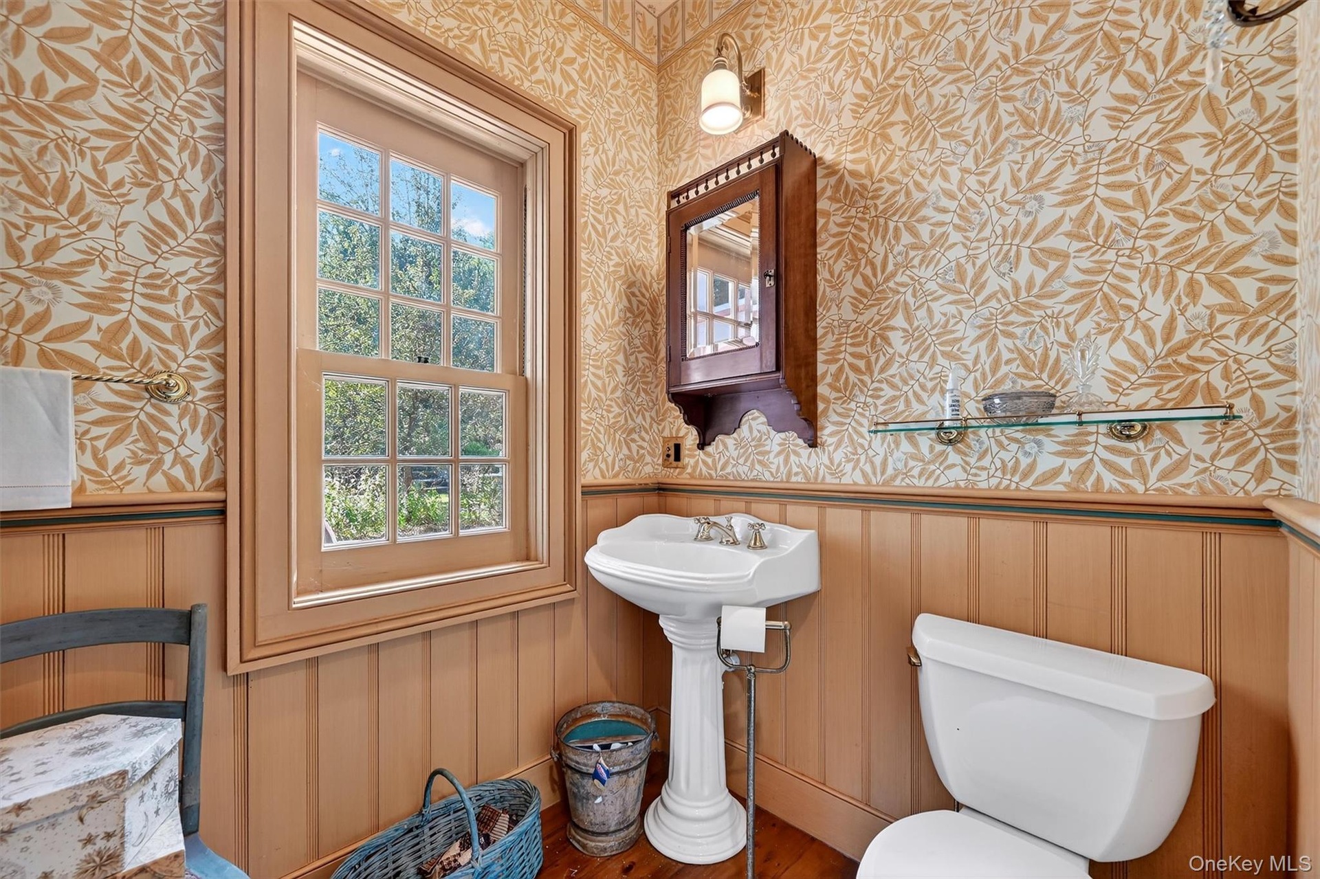 - The bathroom continues its historic charm with warm wood and botanical wallpaper.