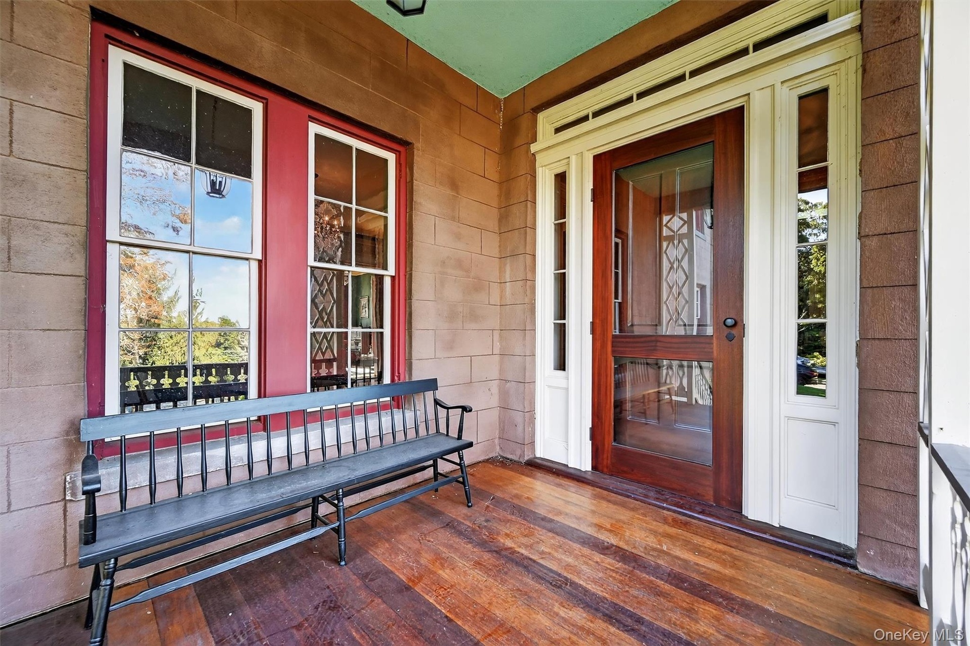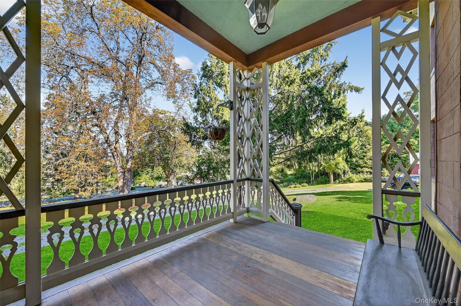 - The covered porch, framed with delicate Victorian latticework, offers a quiet place to pause and take in the estate’s timeless setting—an elegant welc