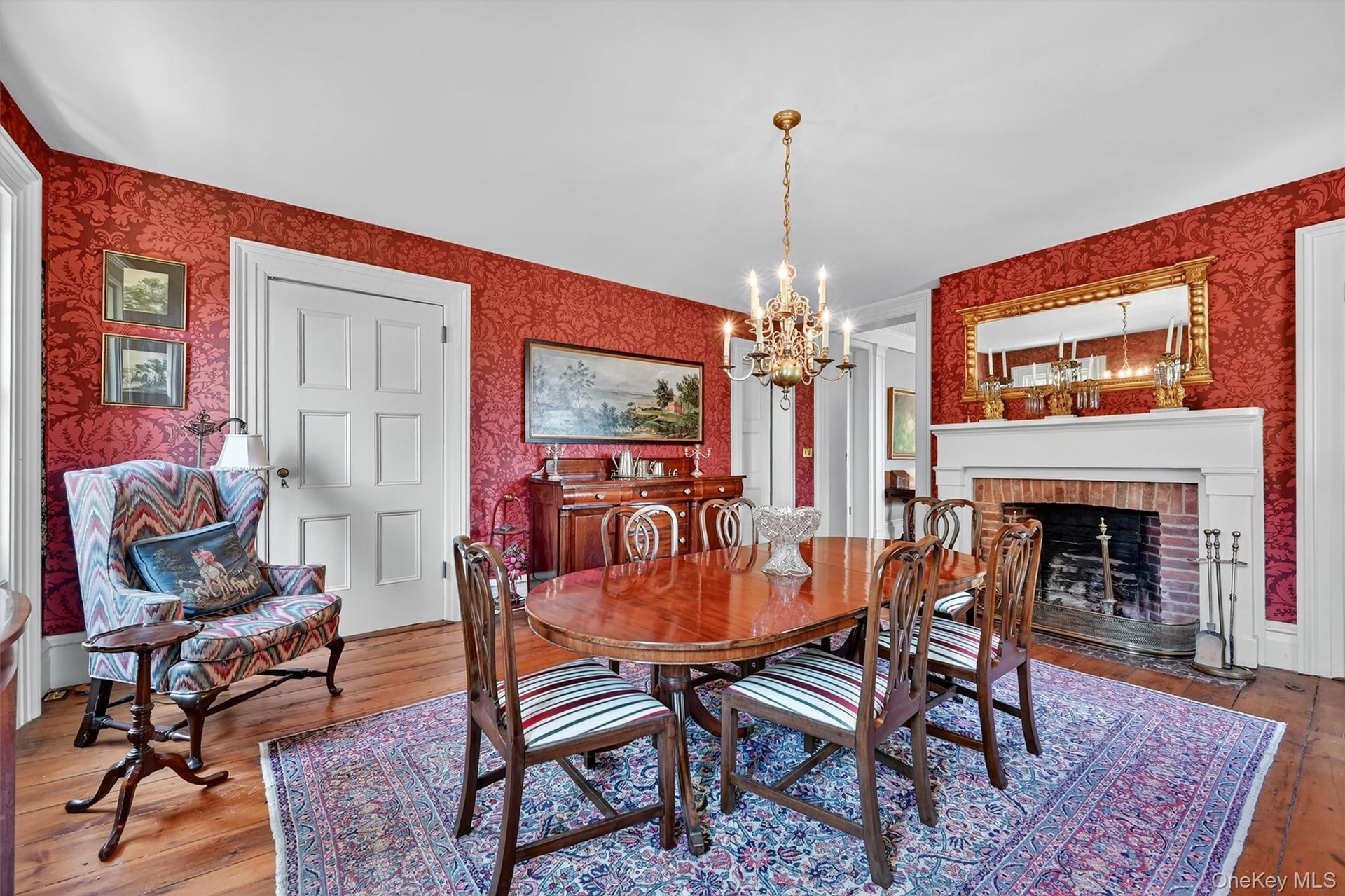 - The formal dining room is richly wrapped in deep red damask walls, offering both drama and warmth. Golden light from the chandelier reflects off polis