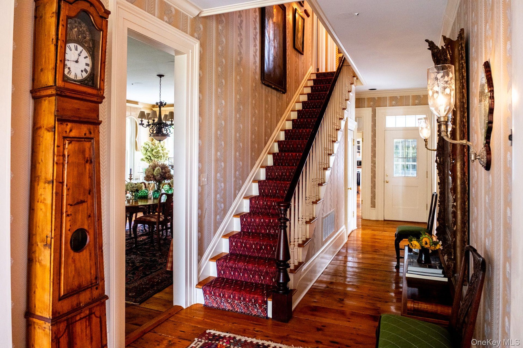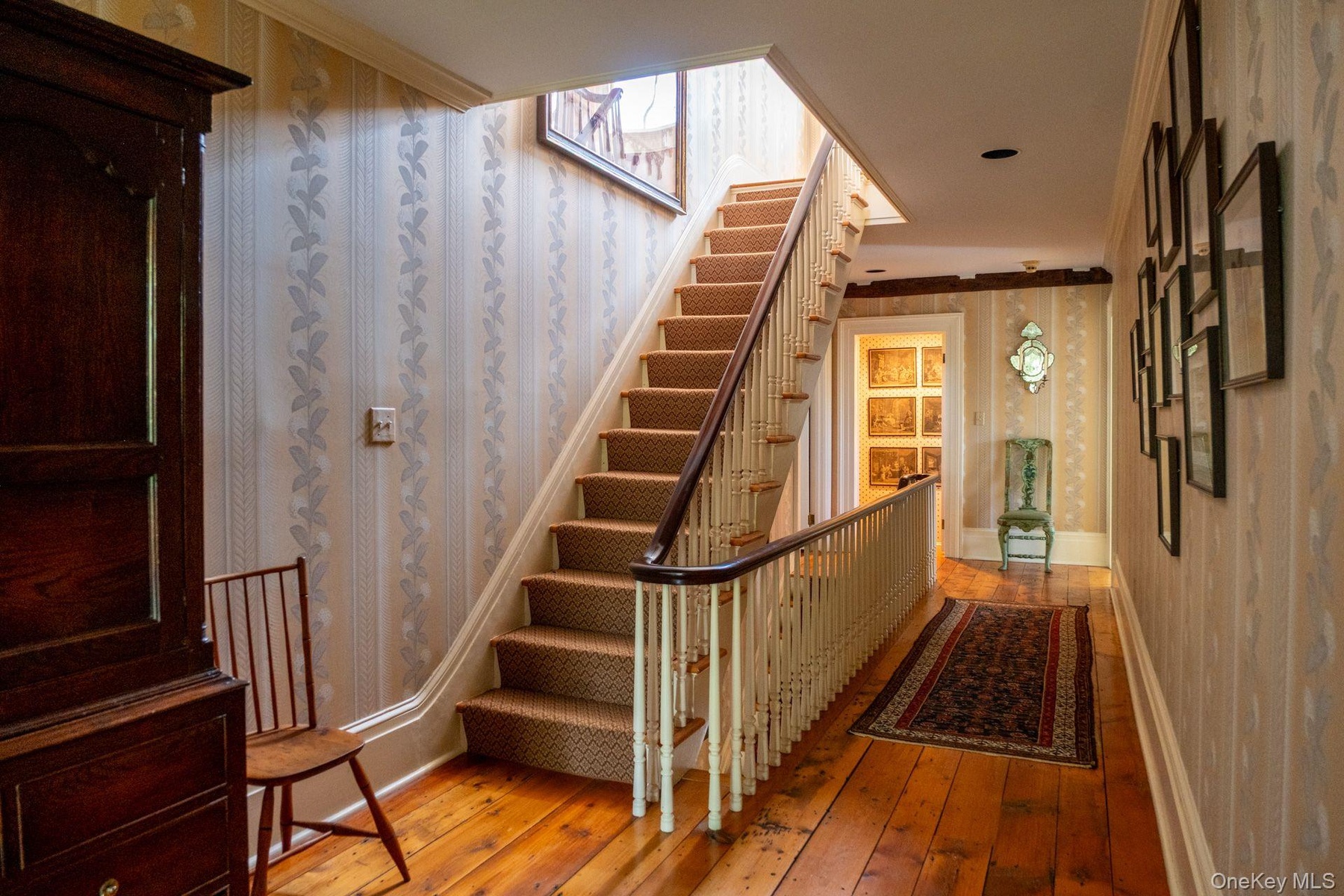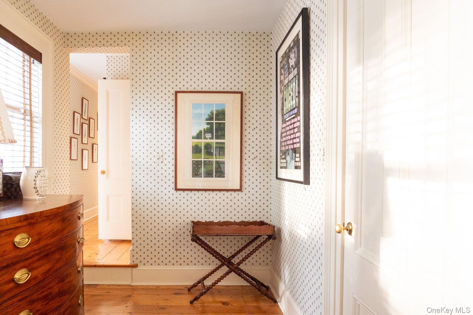 - Hall with wallpapered walls and dark wood-style floors