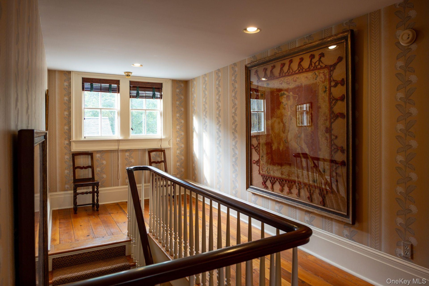 - Stairs featuring wallpapered walls, hardwood / wood-style floors, and recessed lighting