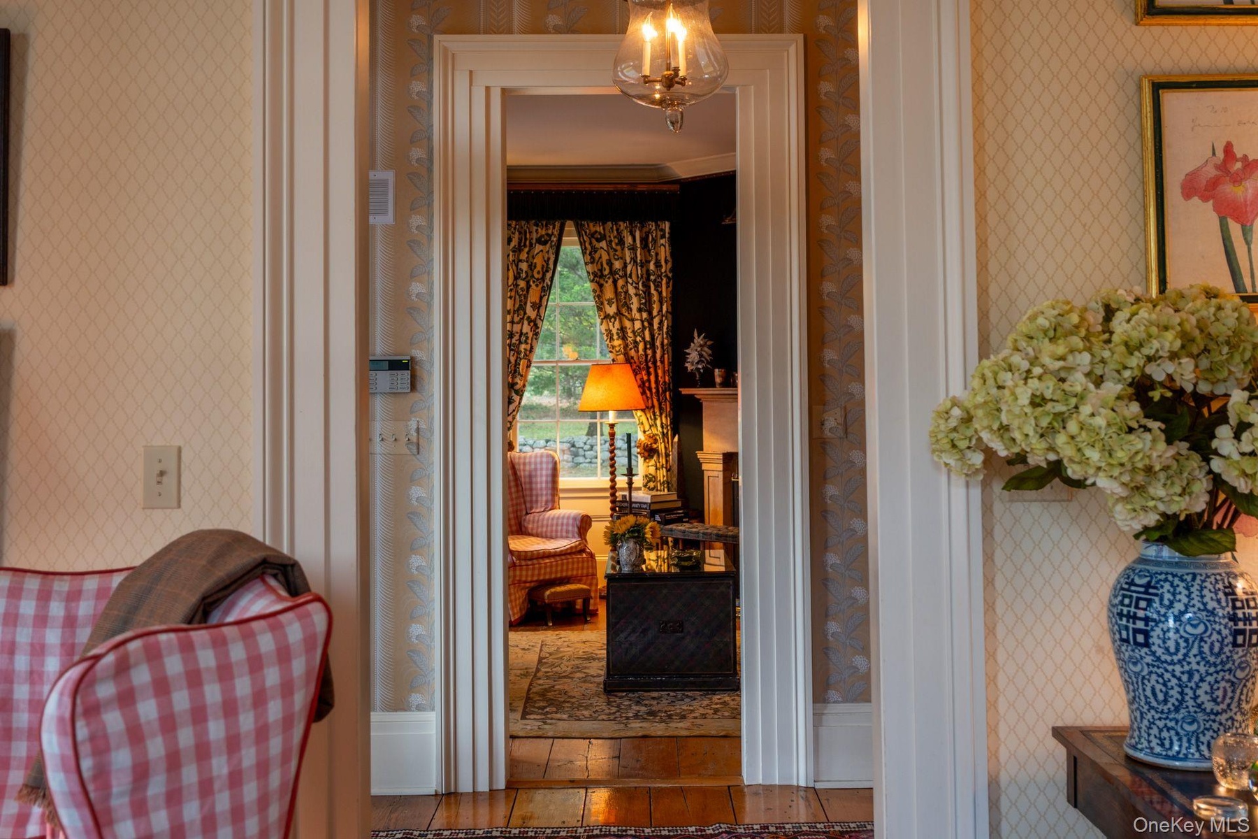 - Detailed view of wallpapered walls and a chandelier