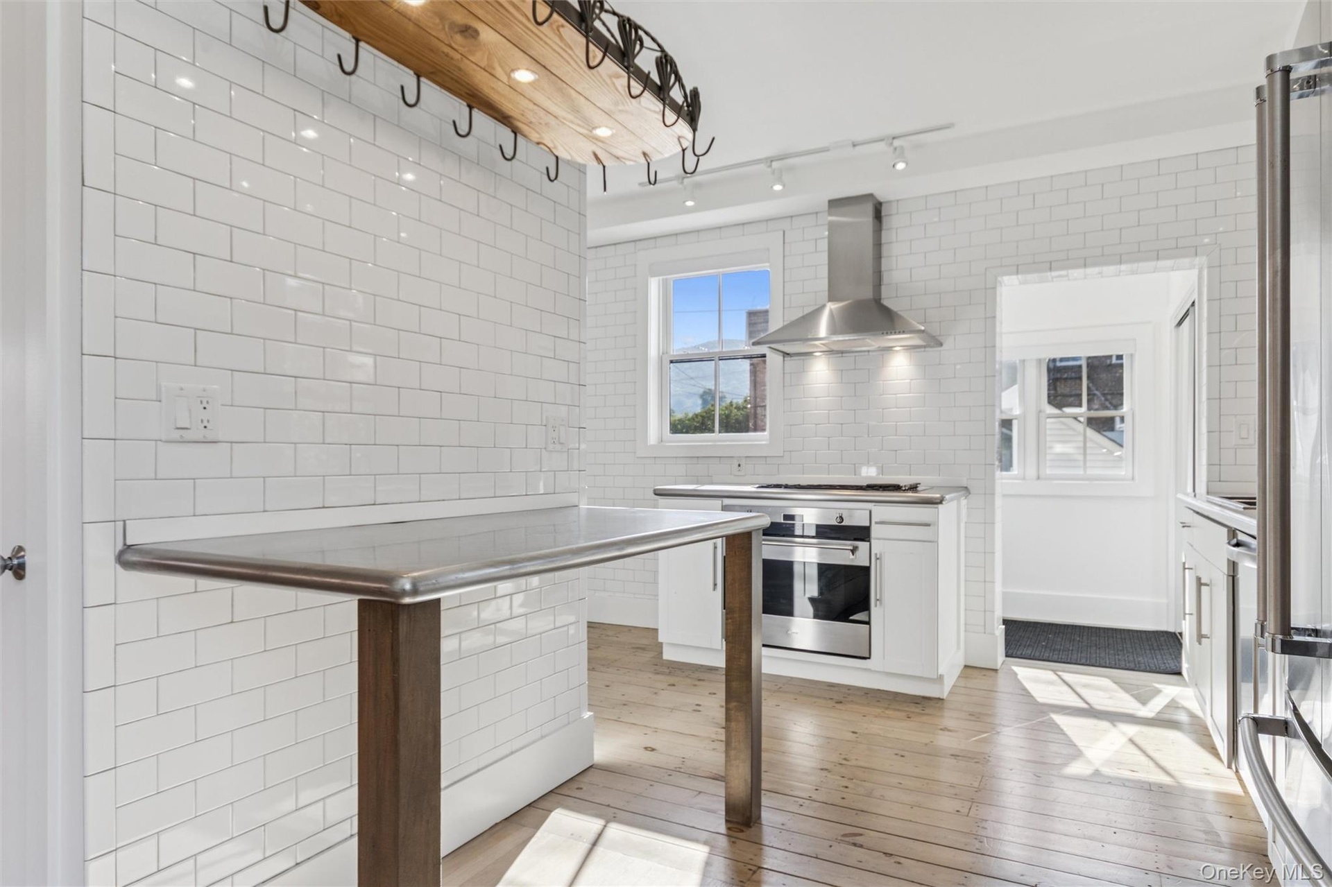 - Kitchen featuring tasteful backsplash, white cabinetry, range hood, and stainless steel appliances