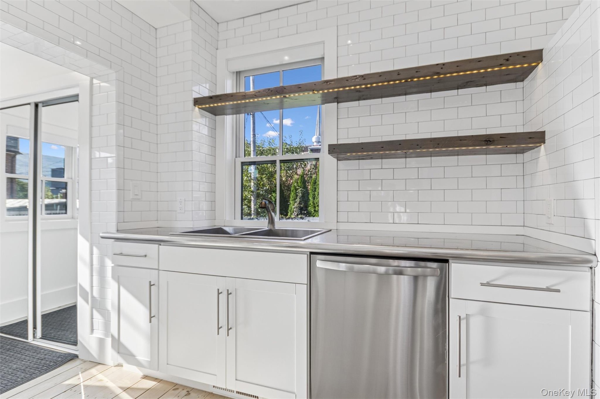 - Kitchen with white cabinets, stainless steel dishwasher, open shelves, and backsplash