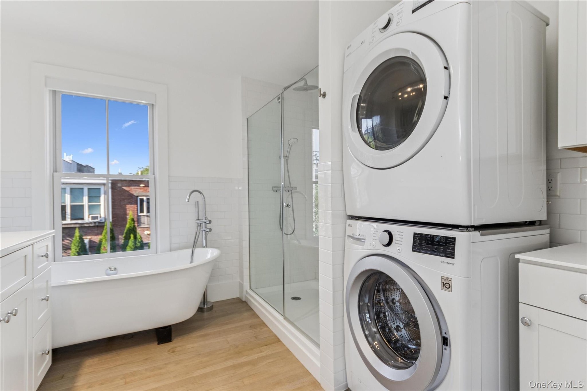 - Full bathroom with a stall shower, a freestanding tub, and stacked washer / dryer