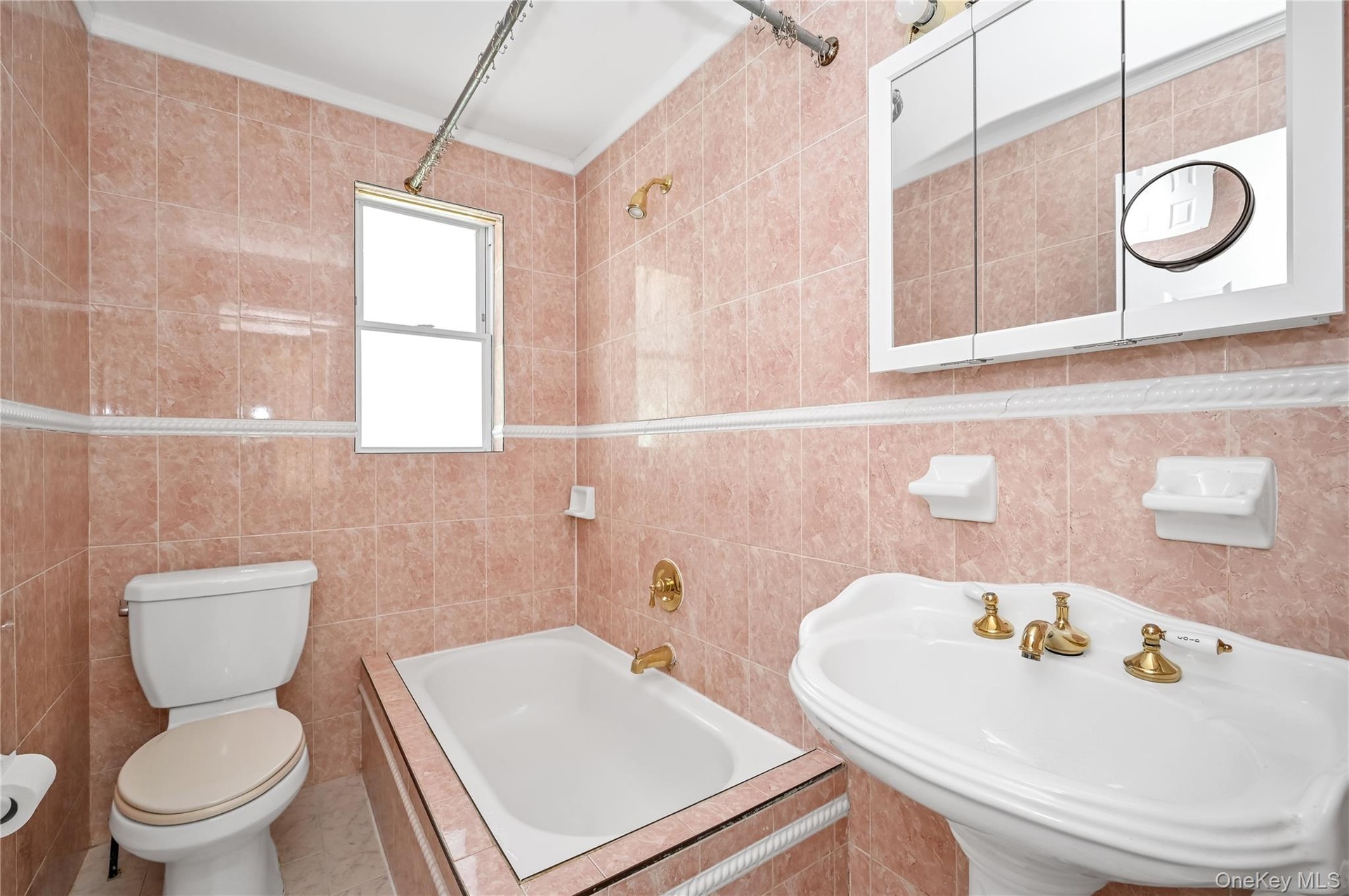 - Full bathroom featuring tiled shower / bath combo and tile walls