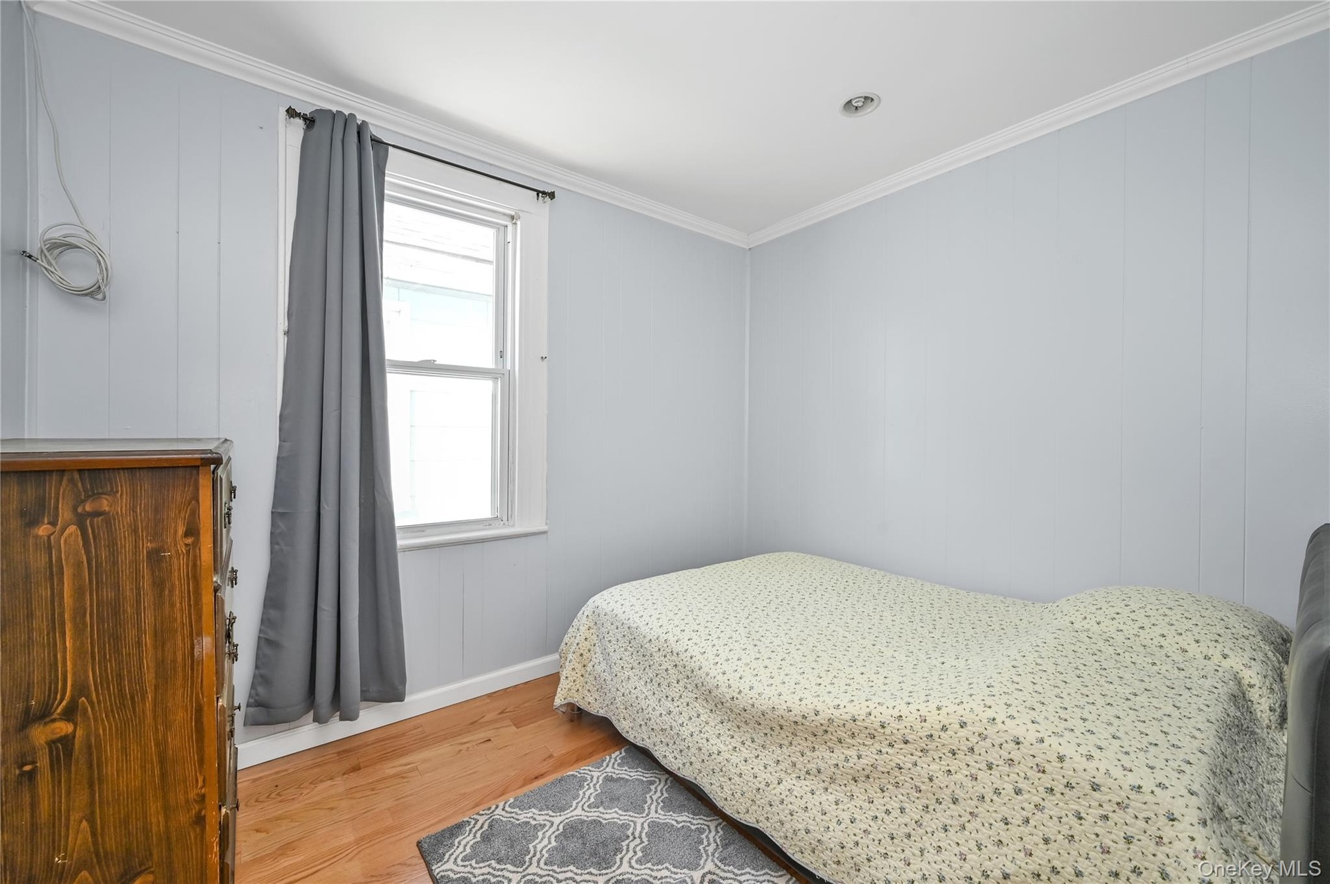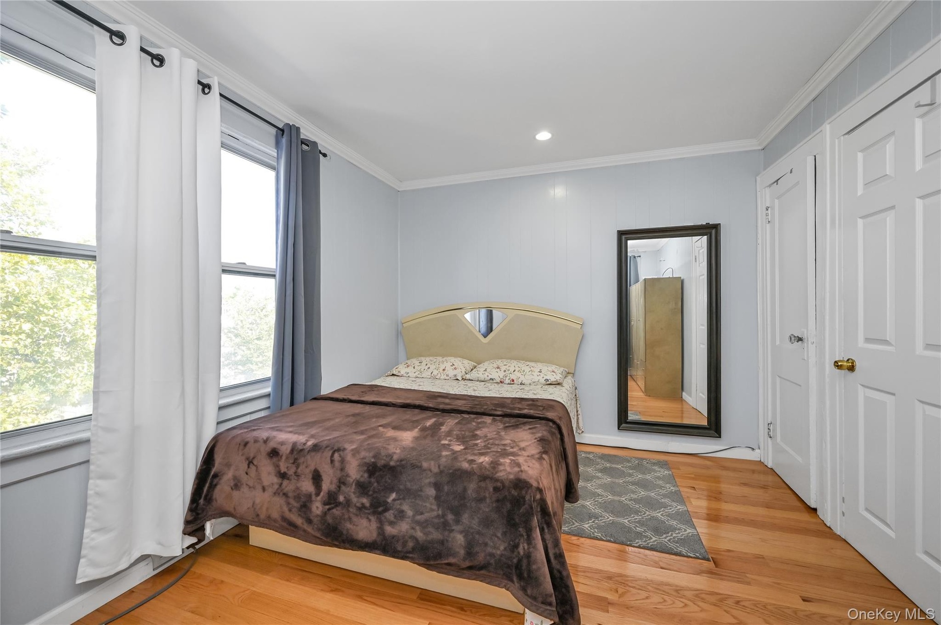 - Bedroom with light wood-style floors and ornamental molding
