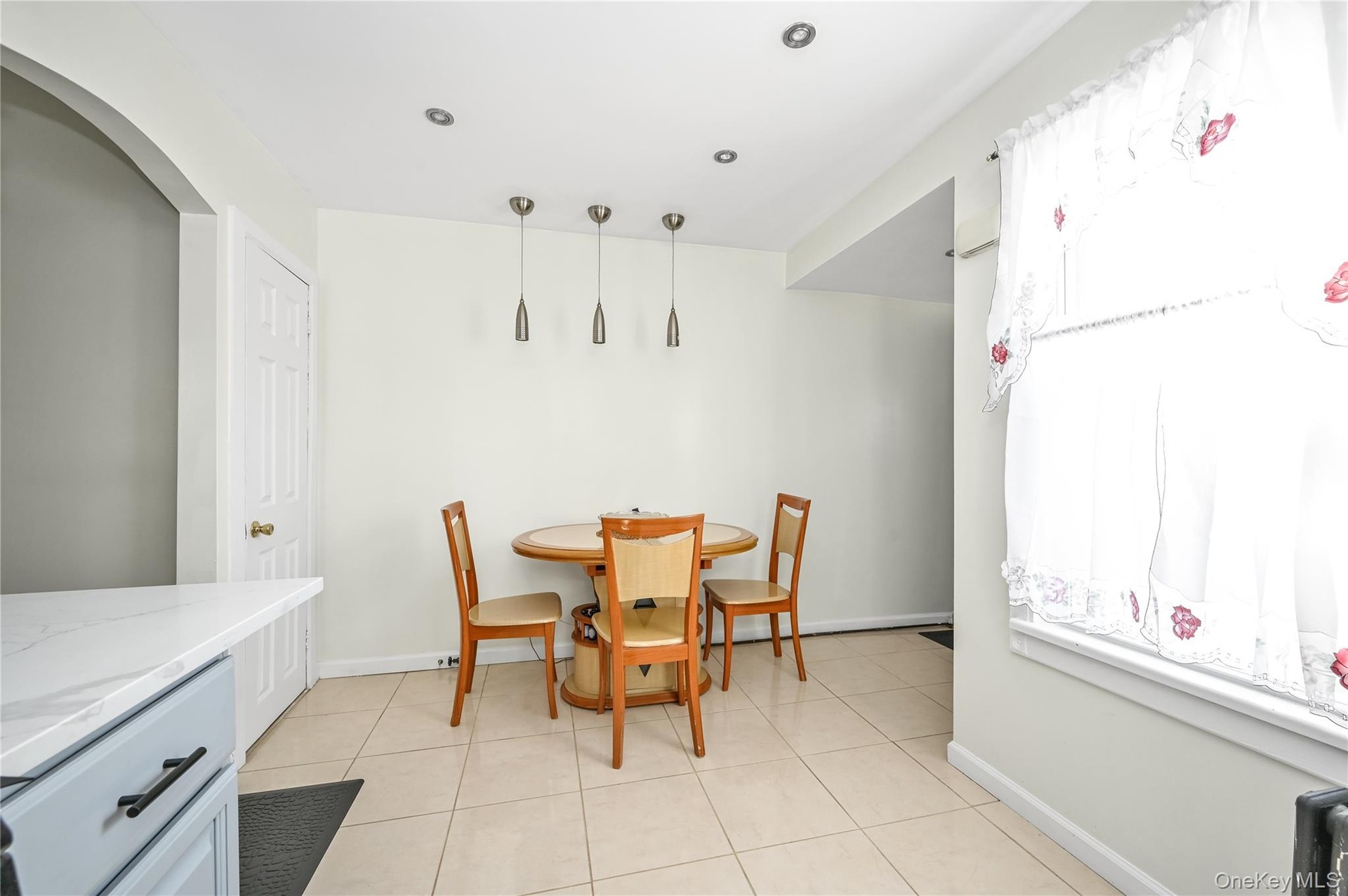 - Dining area featuring light tile patterned floors, healthy amount of natural light, and arched walkways