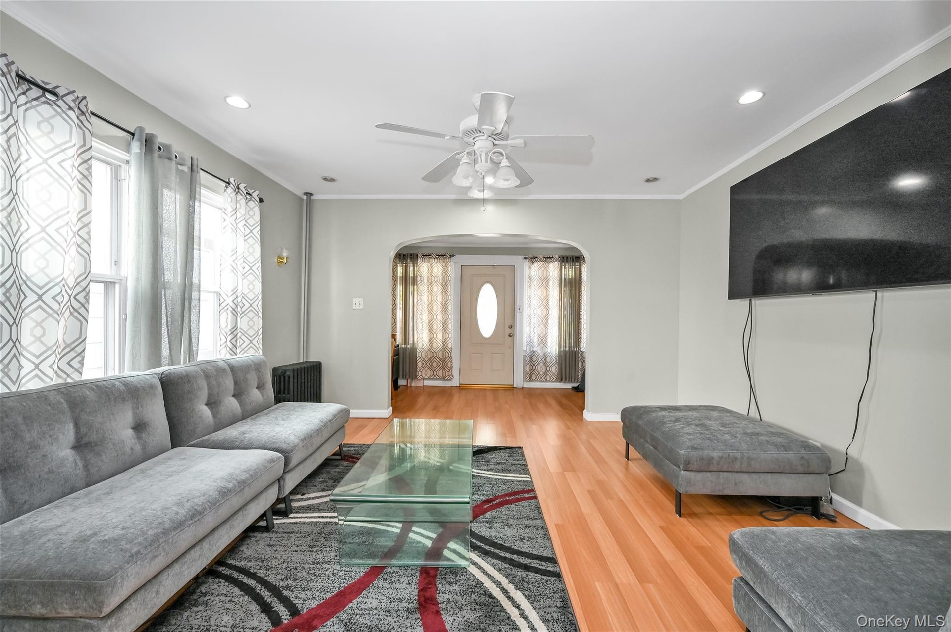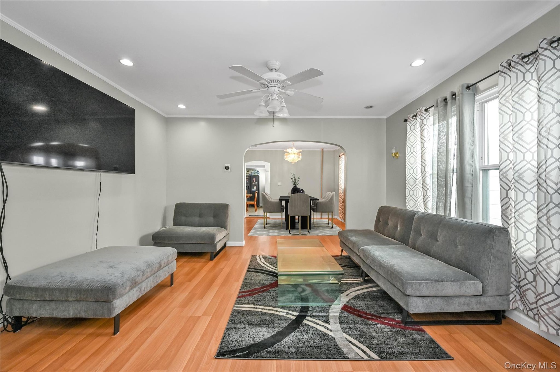 - Living room featuring ornamental molding, arched walkways, wood finished floors, recessed lighting, and ceiling fan