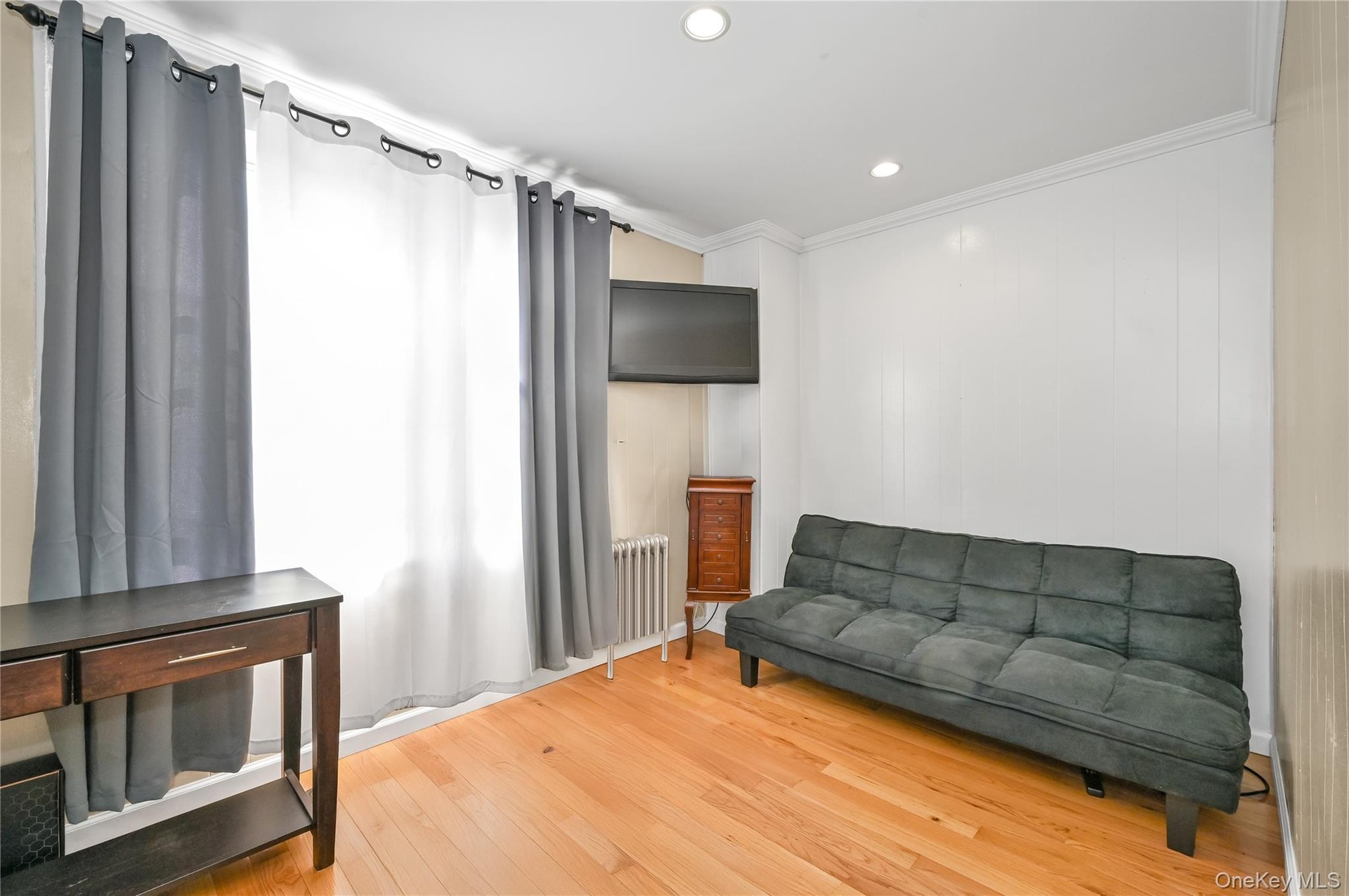 - Sitting room with ornamental molding, wood finished floors, and recessed lighting