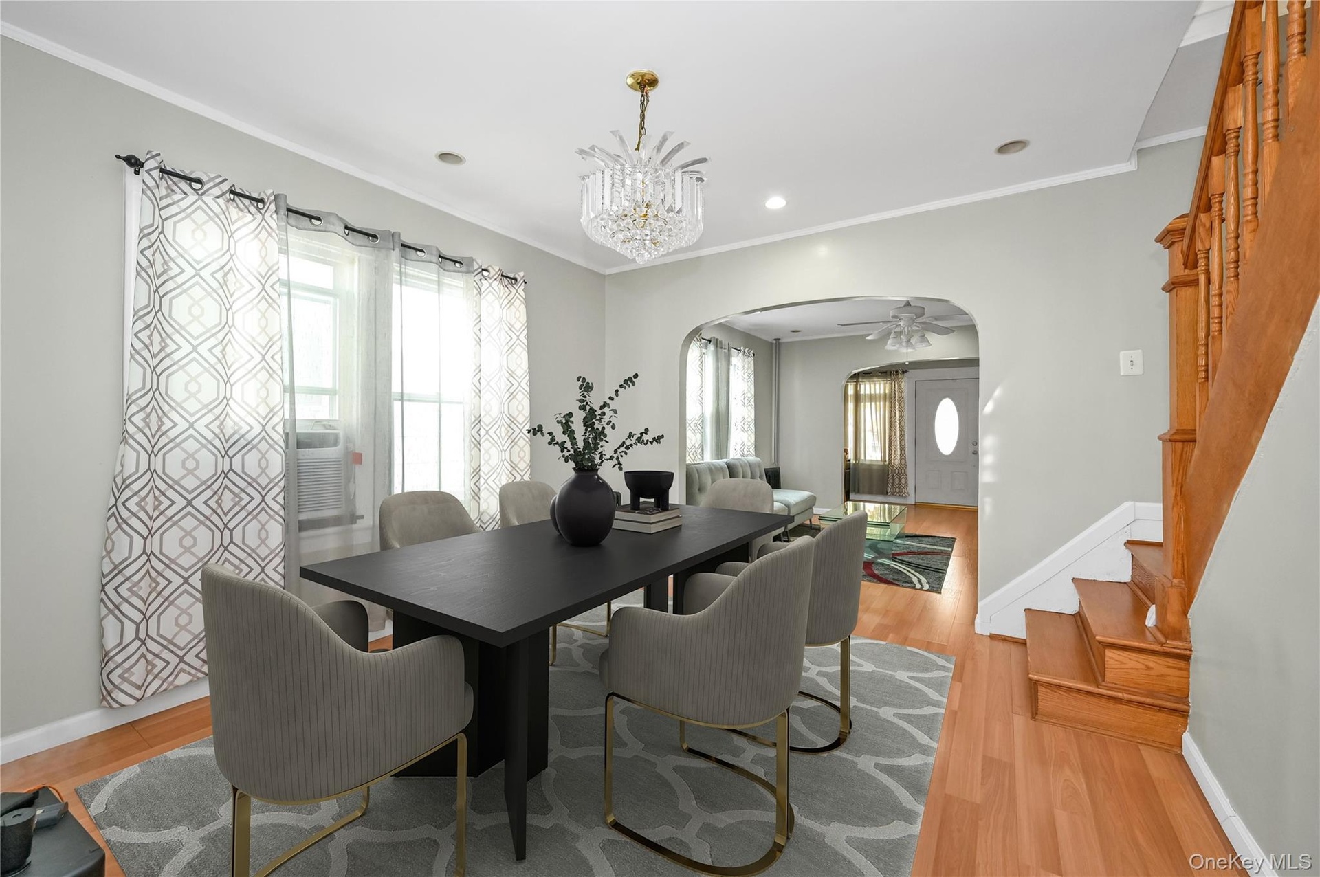 - Dining room featuring arched walkways, ornamental molding, light wood-style floors, stairway, and a chandelier
