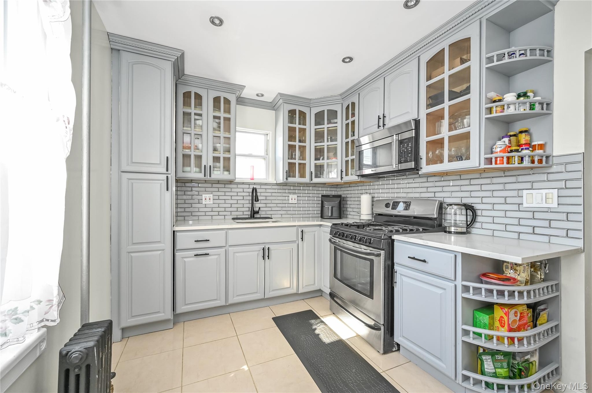 - Kitchen featuring open shelves, appliances with stainless steel finishes, glass insert cabinets, radiator, and light tile patterned flooring