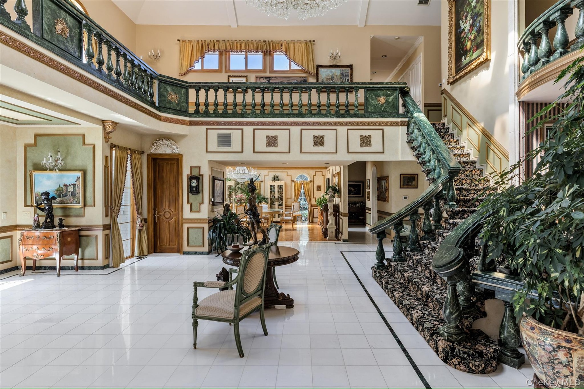- Lobby featuring a towering ceiling, a decorative wall, and stairs