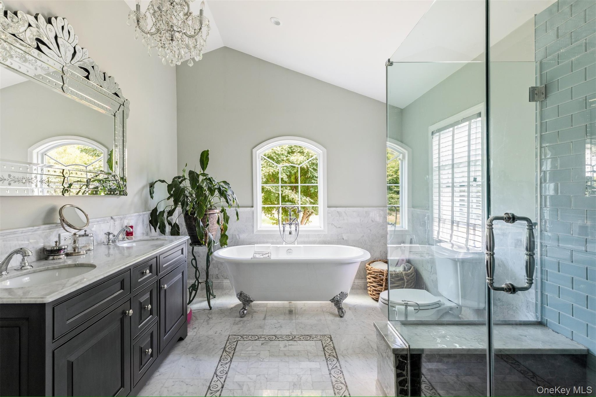 - Bathroom featuring tile walls, a wainscoted wall, a freestanding bath, double vanity, and vaulted ceiling