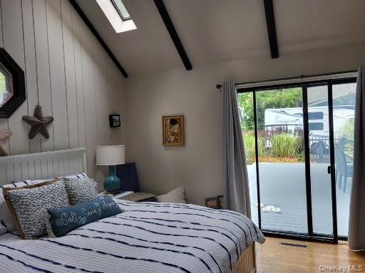 - Bedroom with wood finished floors, a skylight, access to exterior, and wood walls