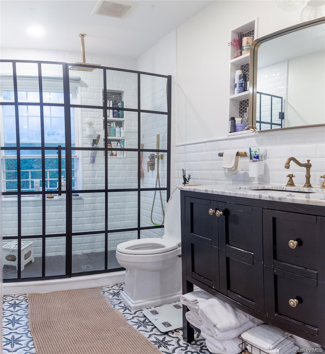 - Full bathroom featuring vanity, a stall shower, and backsplash