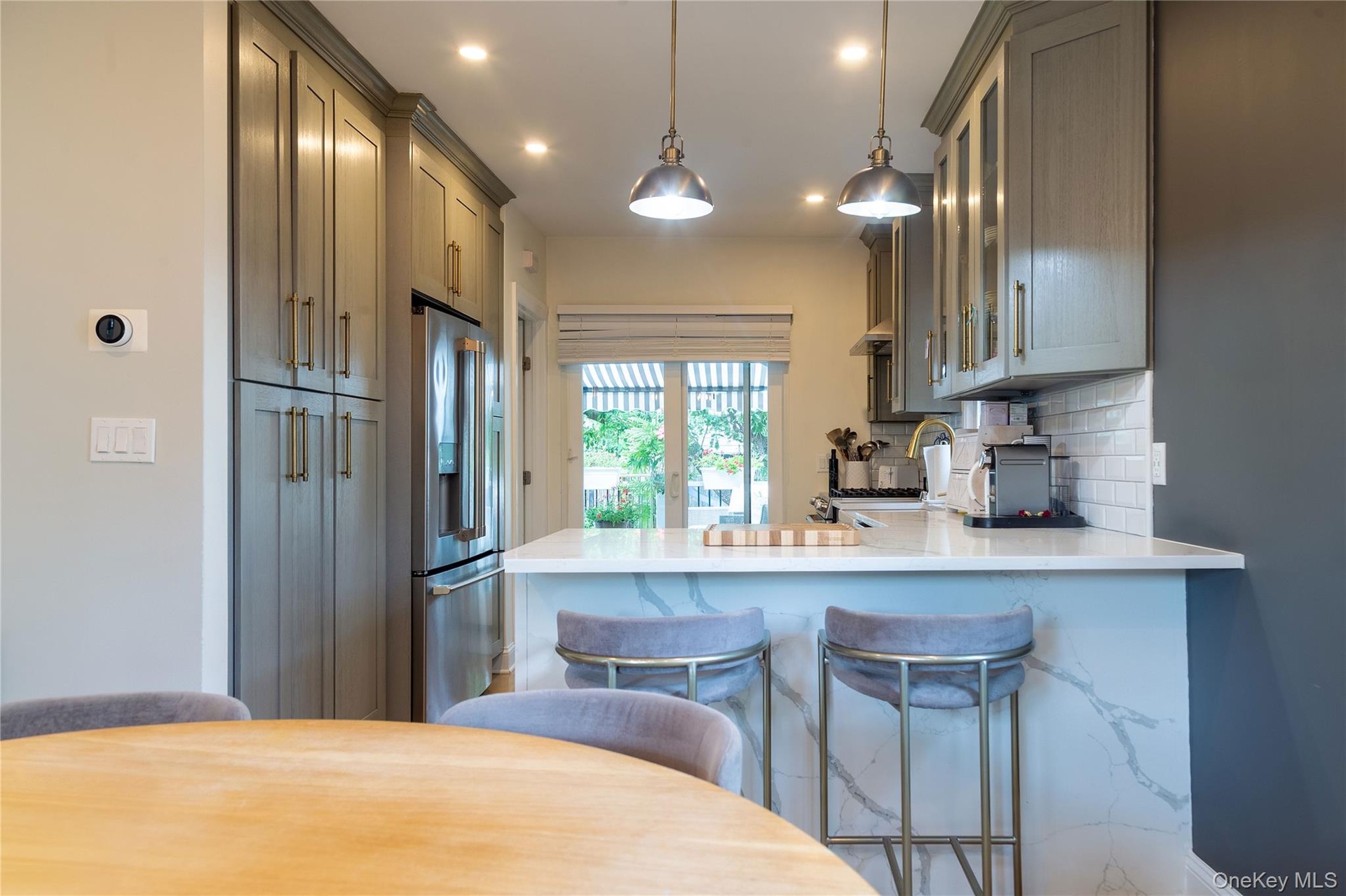- Kitchen with a kitchen bar, backsplash, recessed lighting, light stone counters, and high quality fridge