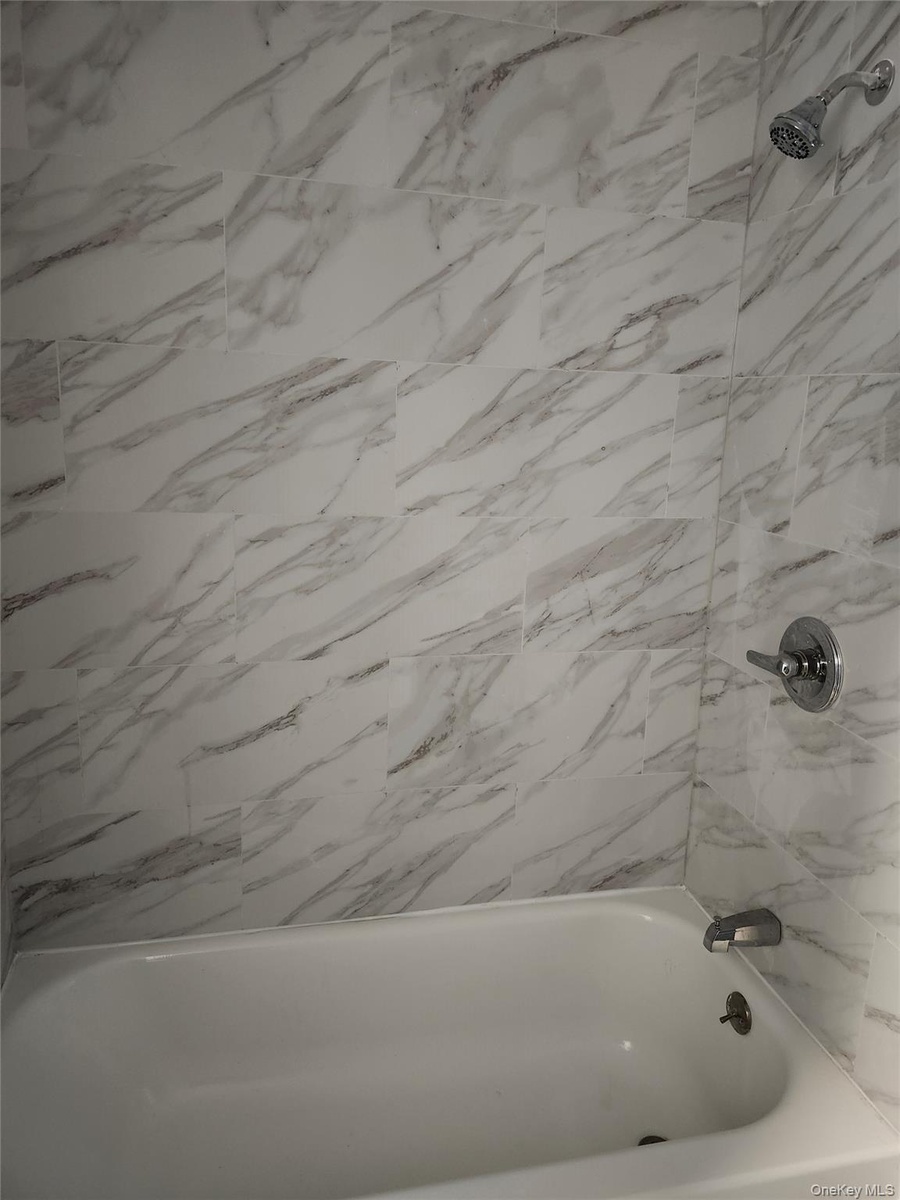 - Full bathroom with light marble finish flooring, bathing tub / shower combination, and a baseboard radiator
