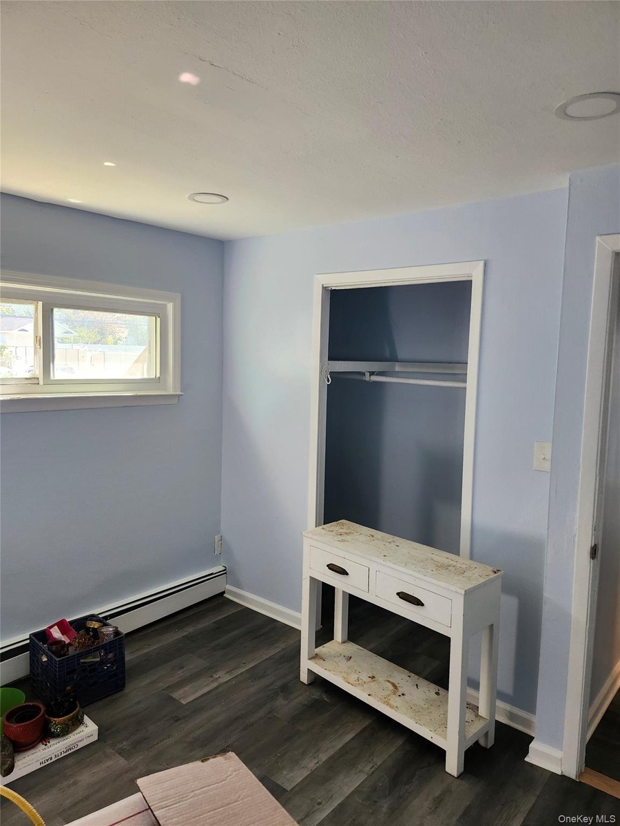 - Bedroom with dark wood-style floors, a baseboard radiator, and recessed lighting