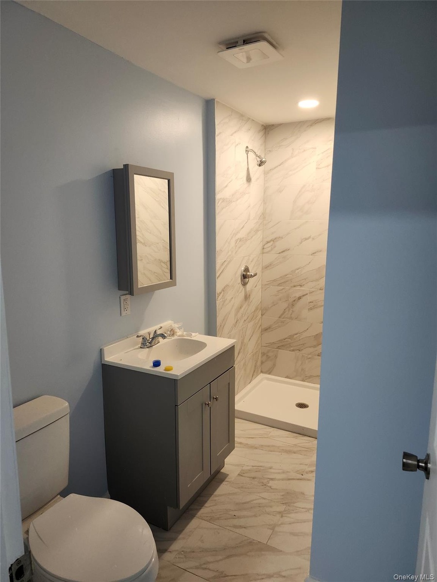 - Full bath featuring light marble finish flooring, vanity, a shower stall, and recessed lighting