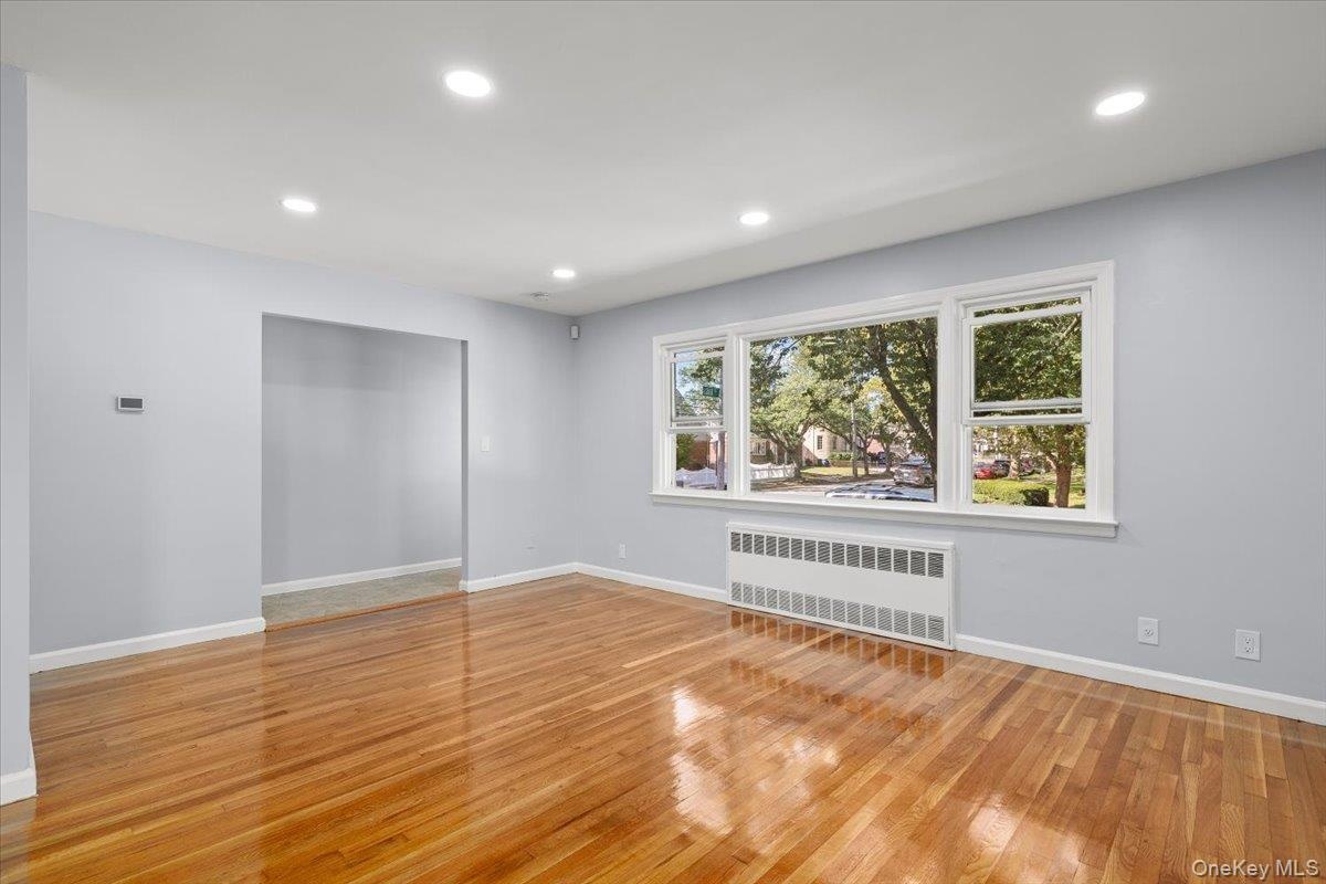- Unfurnished living room with radiator heating unit, recessed lighting, and light wood finished floors