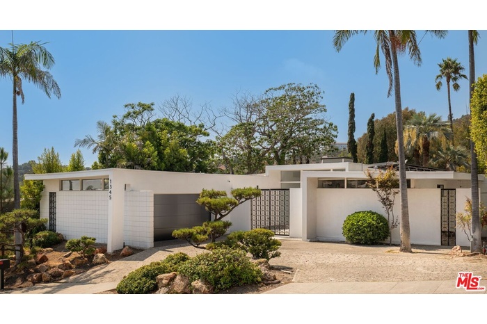 Nestled on one of Bel Air's most prestigious streets, this meticulously restored mid-century masterpiece epitomizes sophisticated California living. Set on an expansive three-quarter-acre west-facing lot, the single-story residence seamlessly marries breathtaking canyon views with an effortless indoor-outdoor lifestyle. The home has been thoughtfully reimagined for contemporary living while preserving its authentic mid-century soul. Original brass-bordered terrazzo floors and rich herringbone hardwood create a foundation of timeless elegance, while expansive walls of glass bathe the interiors in natural light and frame serene canyon vistas. A dramatic skylight adds another layer of illumination, and the iconic round black terrazzo fireplace serves as a striking focal point that anchors the living space. Spanning approximately 3,100 square feet, the residence offers four bedrooms and three-and-a-half bathrooms, complemented by thoughtful entertaining spaces. The spacious primary suite features a walk-in closet and a luxurious bathroom with a steam shower, creating a true spa-like retreat. The dining area includes a sleek wet bar perfect for hosting, while the family room showcases custom built-in cabinetry that seamlessly blends form and function. A dedicated game room and spacious mudroom/laundry complete the interior layout. The outdoor spaces are equally impressive, featuring a resort-style pool and spa, professional BBQ area, and expansive flat grassy yard - all designed for both intimate gatherings and grand-scale entertaining. A two-car garage with direct access and a circular motor court with ample parking. This is a rare, turnkey offering in prime Bel Air - an architectural gem where classic mid-century design meets modern luxury in a truly exceptional canyon setting.