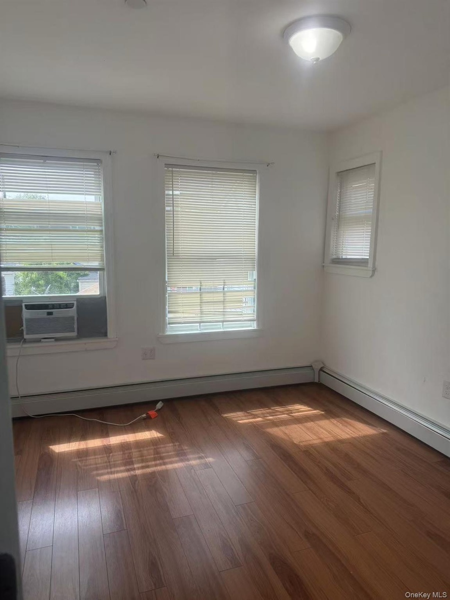- Unfurnished bedroom featuring baseboard heating, wood finished floors, multiple windows, and cooling unit