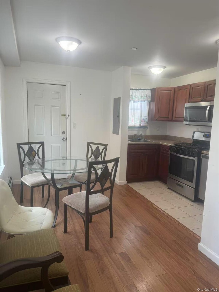 - Kitchen with stainless steel appliances, light wood-type flooring, electric panel, and brown cabinetry