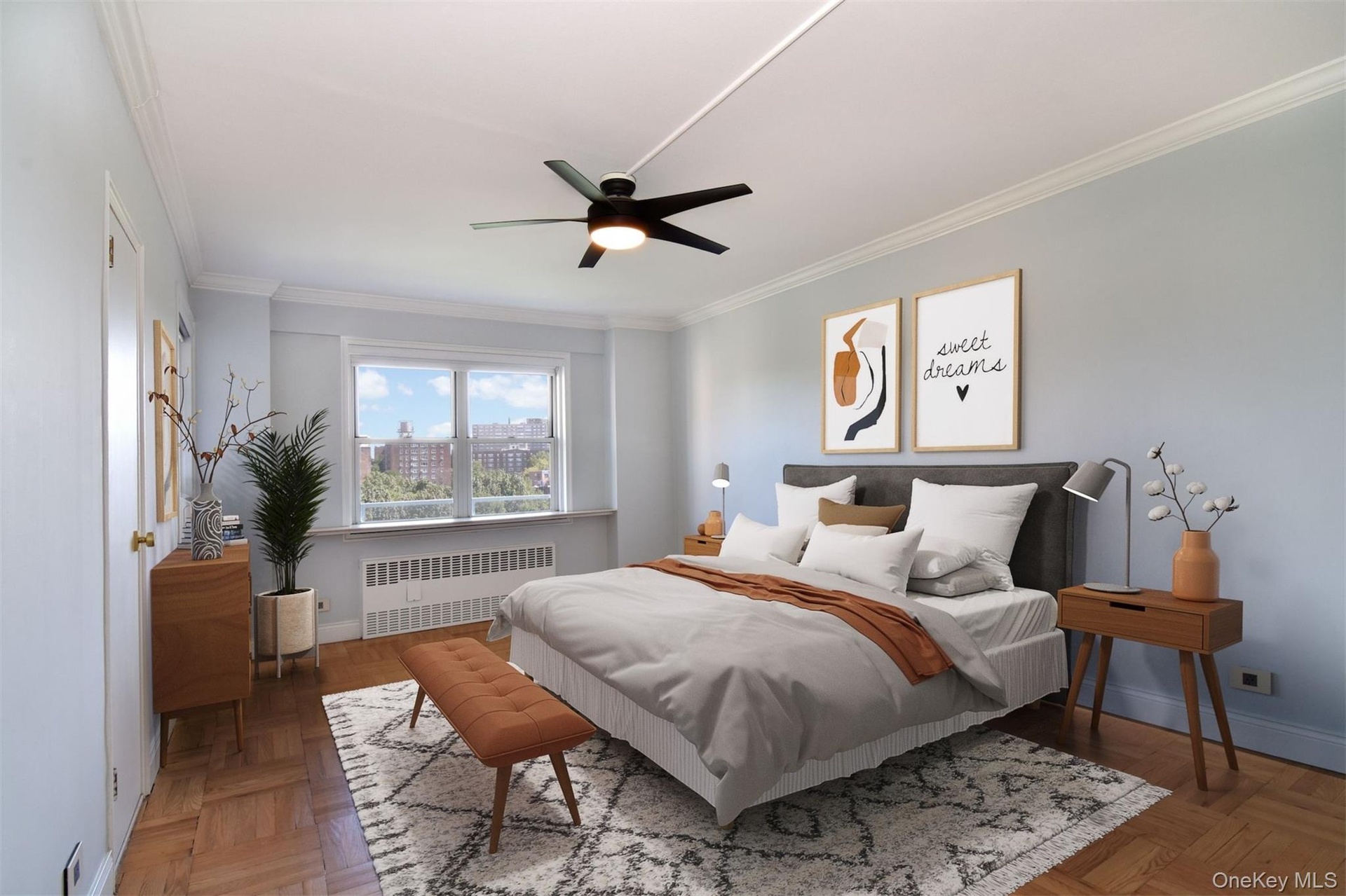 - Bedroom featuring radiator heating unit, ornamental molding, and ceiling fan
