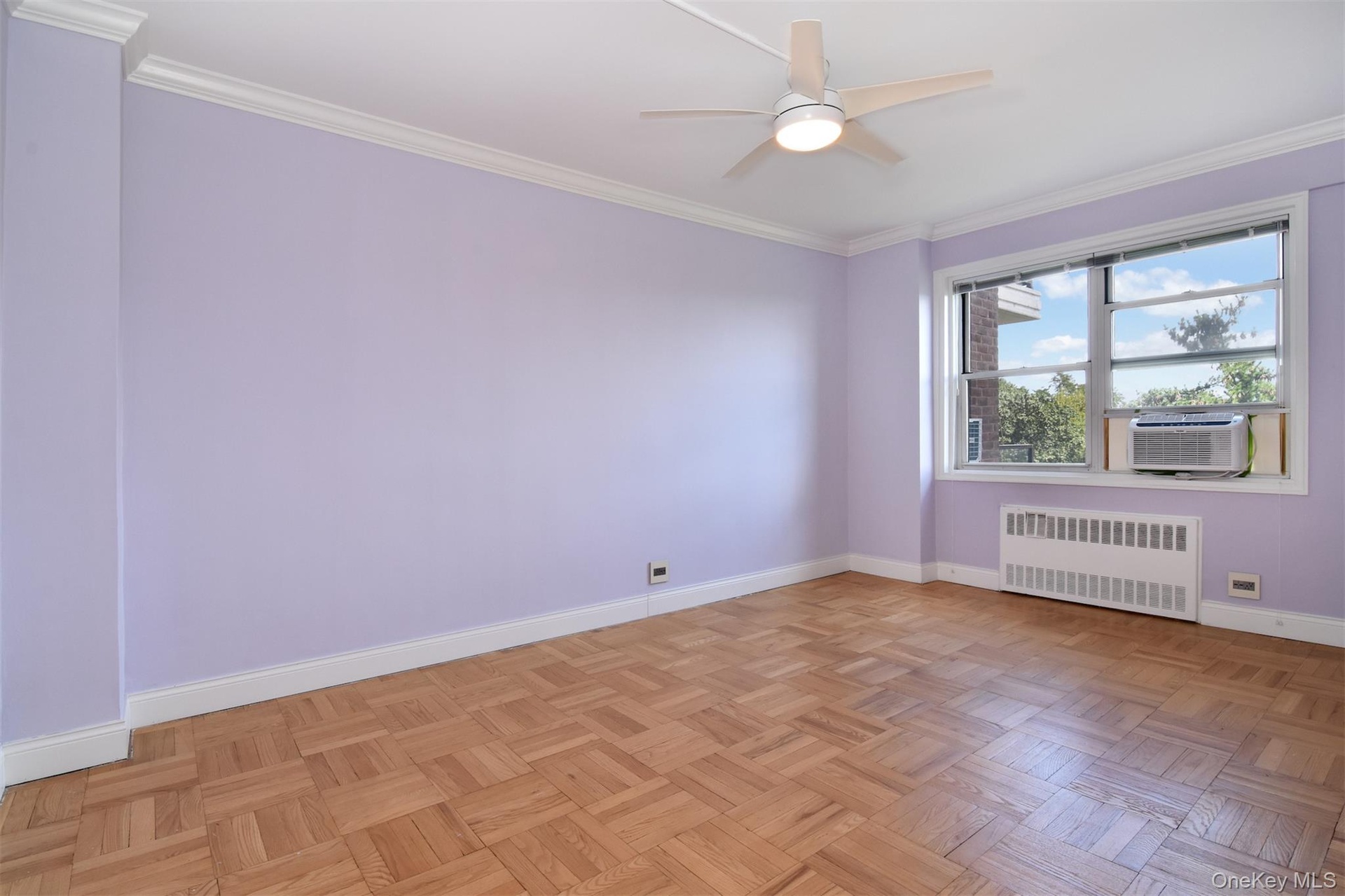 - Unfurnished room featuring radiator, ornamental molding, ceiling fan, and cooling unit
