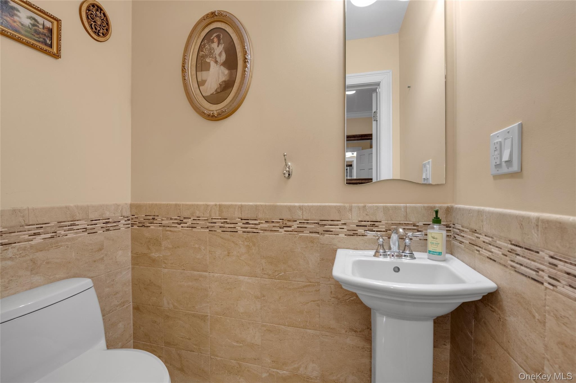 - Half bathroom featuring tile walls and a wainscoted wall