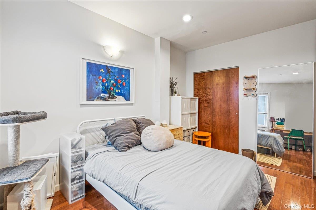 - Bedroom with wood finished floors, recessed lighting, and a closet