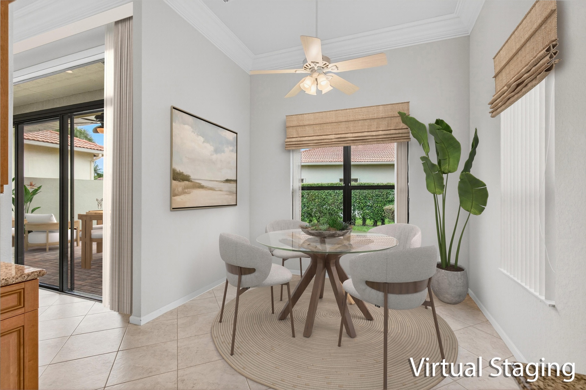 AGGRESSIVELY PRICED for today's market, this home offers privacy and a SNEAK PEEK of the lake-without the cost of a full lakefront! Plus a $5000 seller credit at closing. Enjoy alfresco dining on the extended paver patio, surrounded by total privacy, with plenty of room to build your own pool.This pristine Grigio model showcases diagonal tile throughout and wood-look porcelain planks in the primary suite. High ceilings flood the home with natural light and are beautifully accented by large crown molding. The oversized breakfast room-perfect for morning coffee-offers the best lake view from the home.