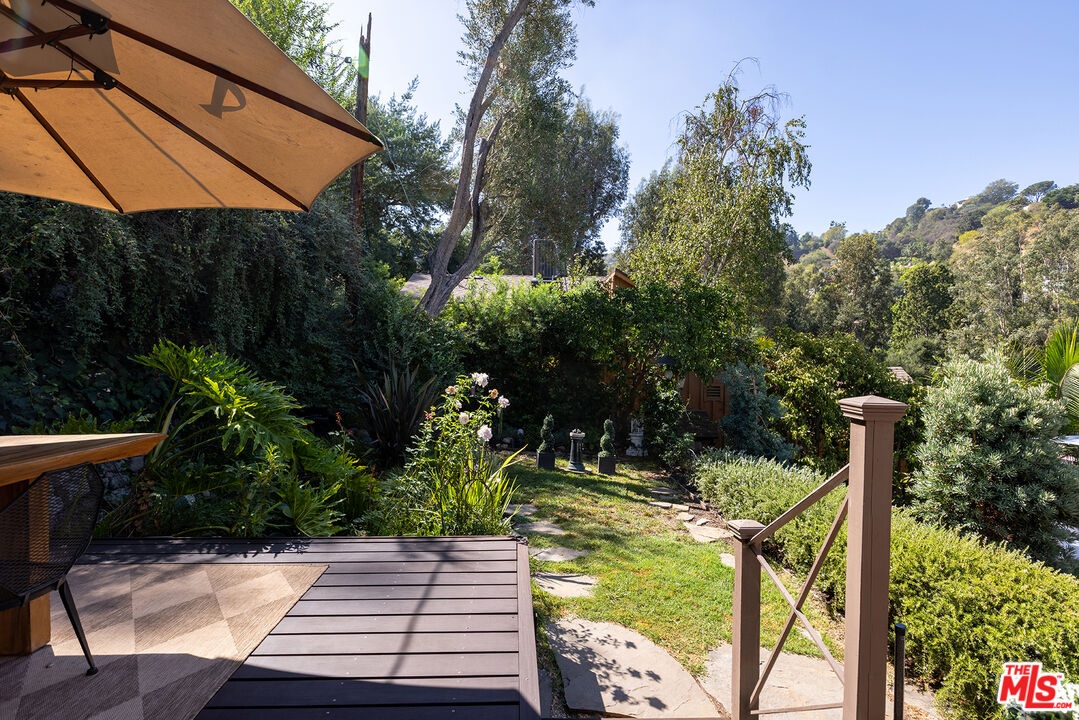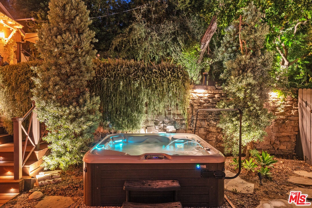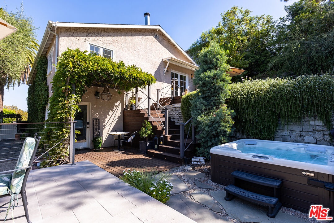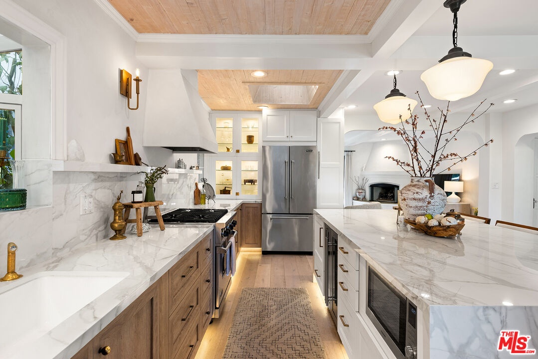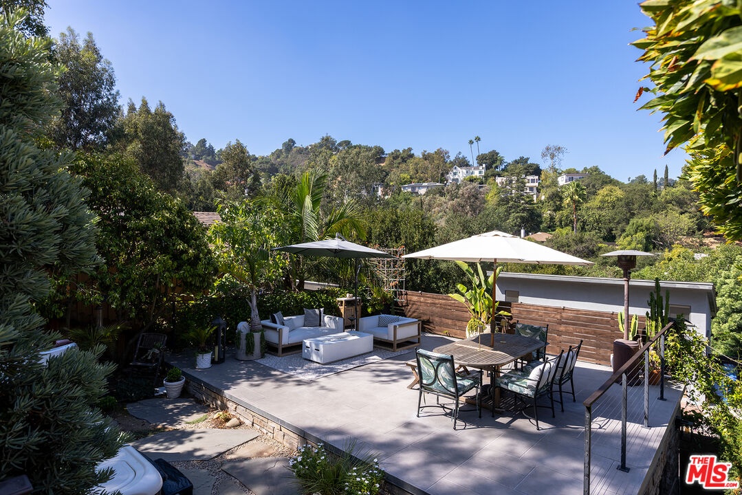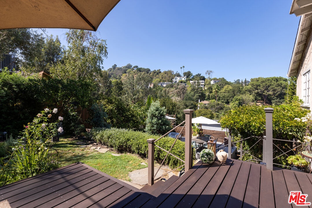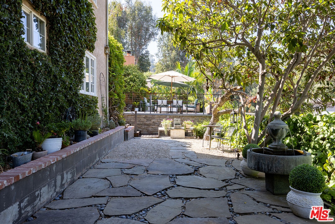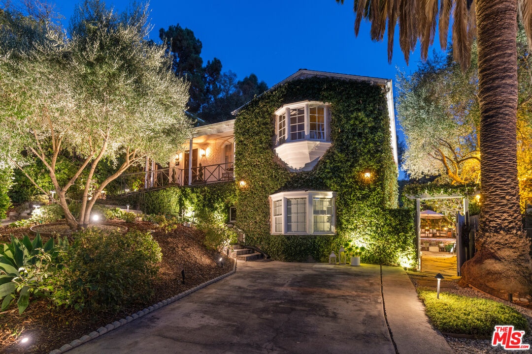 Nestled in the Hollywood Hills on a corner lot is this elegant 1934 traditional gated home surrounded by serene canyon vistas offering 4 bedrooms and 3 bathrooms with 2,352 of interior square footage spanning over two-stories. This sophisticated residence tastefully combines the modern conveniences of today and timeless old-world charm that will have you feeling like you're on a European getaway. Beamed ceilings, decorative archways, new hardwood floors, Mullion windows, original doors and imported hardware seamlessly meld together to create an alluring ambience. The main level is comprised of a reimagined open living space that includes a newly remodeled eat-in kitchen with an oversized waterfall island accommodating seating for four, top of the line stainless steel appliances including a wine fridge, wood paneled ceilings, custom lighting and pantry. Adjacent to the kitchen is an inviting den featuring an adobe fireplace, and French doors that open to lush gardens, meandering pathways, lily pad dotted pond, mature fruit trees, multiple seating and dining areas plus an expansive roof top deck perfect al fresco dining or hosting a lavish party under the stars on the magical sprawling grounds. All three guest bedrooms also on the main level are drenched in sunlight and enjoy beautiful vistas of the hills. The lower level offers its own separate entrance and consists entirely of a spacious primary suite with new Chevron white oak floors, a chic updated bathroom with dual vanity, separate shower and tub, a flexible office/sitting area, built-in vanity area and extra storage. Conveniently located near Universal Studios, the iconic Hollywood Bowl, hiking trails, popular restaurants and shops in both Studio City and Hollywood with several neighborhood eateries just blocks away. A detached three-car garage, hot tub and gated driveway with keypad security entrance complete this private Hollywood Hills oasis.