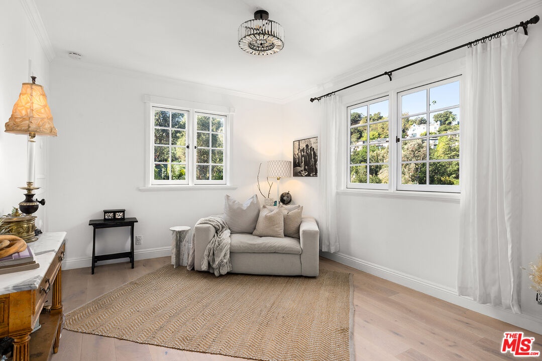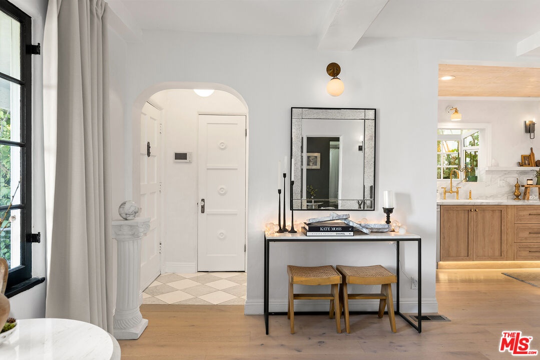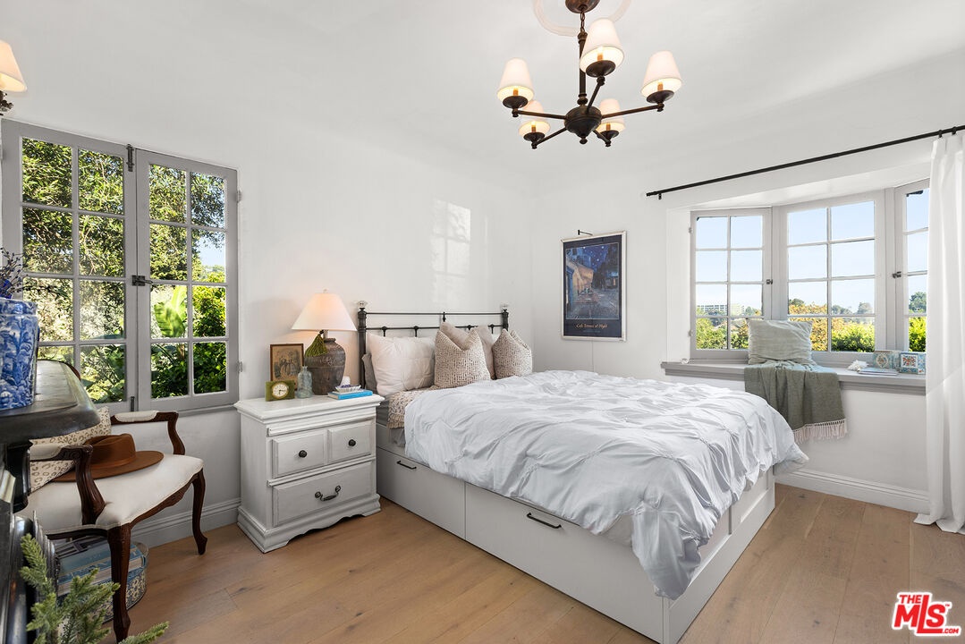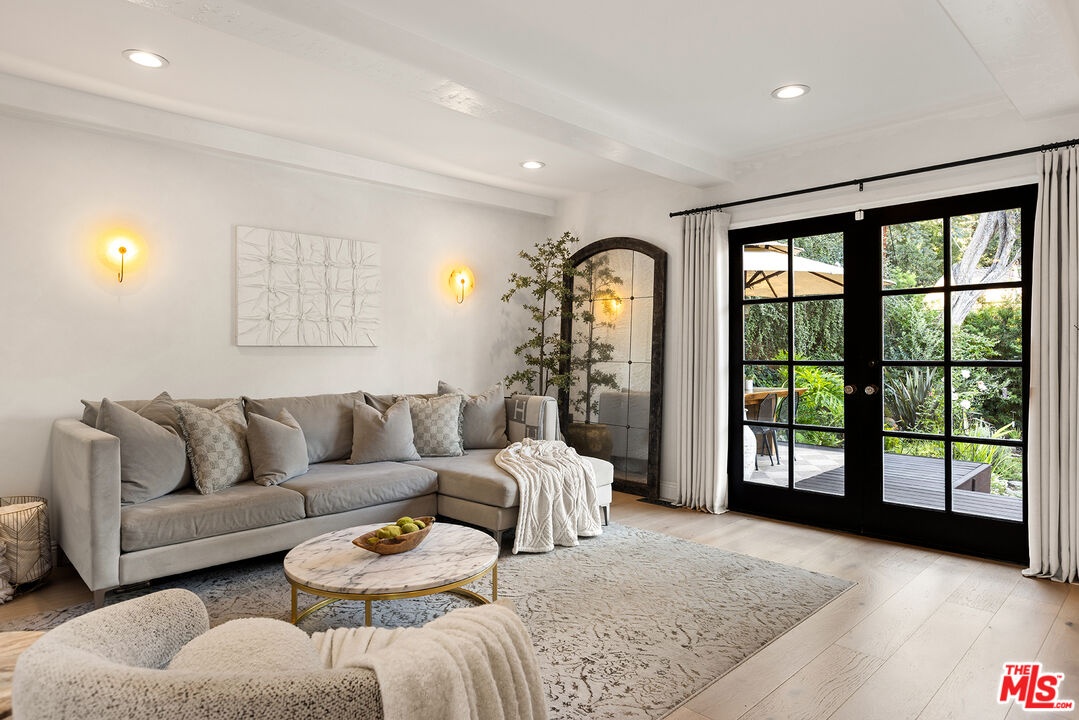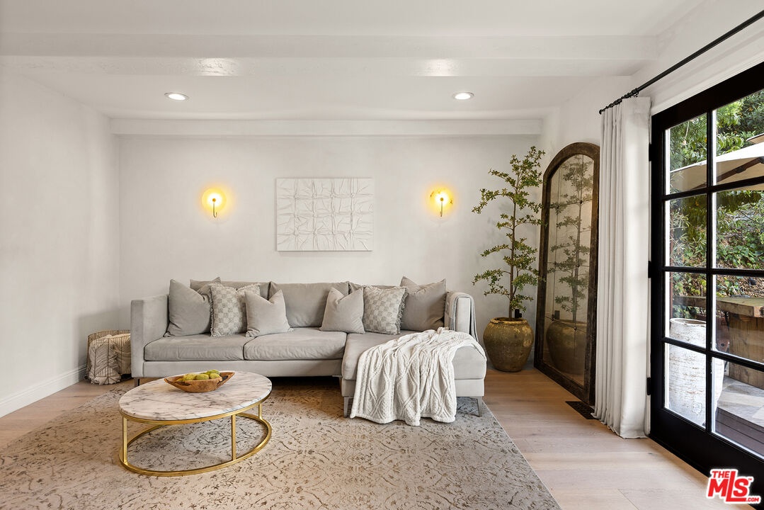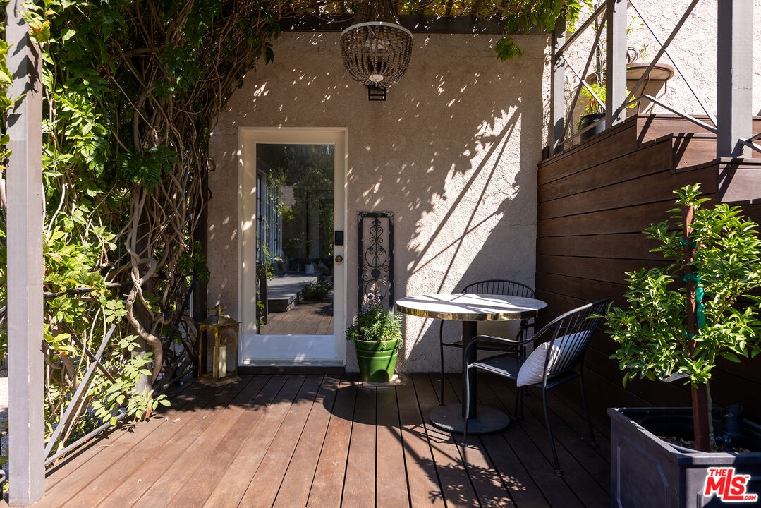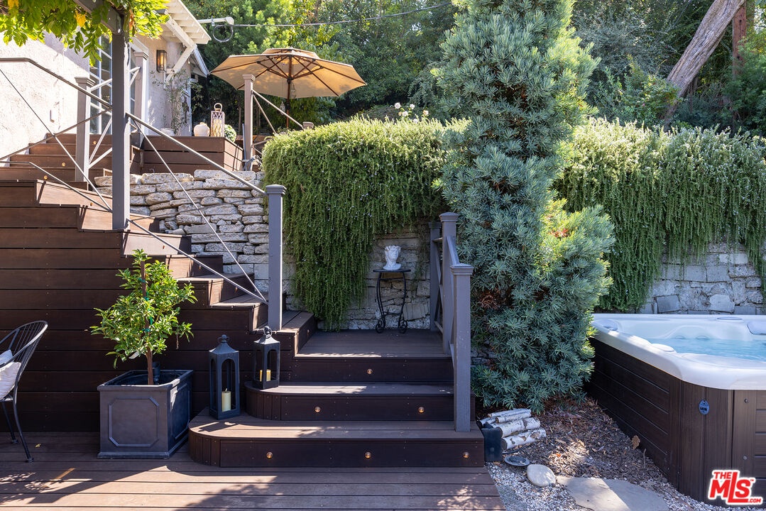 Nestled in the Hollywood Hills on a corner lot is this elegant 1934 traditional gated home surrounded by serene canyon vistas offering 4 bedrooms and 3 bathrooms with 2,352 of interior square footage spanning over two-stories. This sophisticated residence tastefully combines the modern conveniences of today and timeless old-world charm that will have you feeling like you're on a European getaway. Beamed ceilings, decorative archways, new hardwood floors, Mullion windows, original doors and imported hardware seamlessly meld together to create an alluring ambience. The main level is comprised of a reimagined open living space that includes a newly remodeled eat-in kitchen with an oversized waterfall island accommodating seating for four, top of the line stainless steel appliances including a wine fridge, wood paneled ceilings, custom lighting and pantry. Adjacent to the kitchen is an inviting den featuring an adobe fireplace, and French doors that open to lush gardens, meandering pathways, lily pad dotted pond, mature fruit trees, multiple seating and dining areas plus an expansive roof top deck perfect al fresco dining or hosting a lavish party under the stars on the magical sprawling grounds. All three guest bedrooms also on the main level are drenched in sunlight and enjoy beautiful vistas of the hills. The lower level offers its own separate entrance and consists entirely of a spacious primary suite with new Chevron white oak floors, a chic updated bathroom with dual vanity, separate shower and tub, a flexible office/sitting area, built-in vanity area and extra storage. Conveniently located near Universal Studios, the iconic Hollywood Bowl, hiking trails, popular restaurants and shops in both Studio City and Hollywood with several neighborhood eateries just blocks away. A detached three-car garage, hot tub and gated driveway with keypad security entrance complete this private Hollywood Hills oasis.