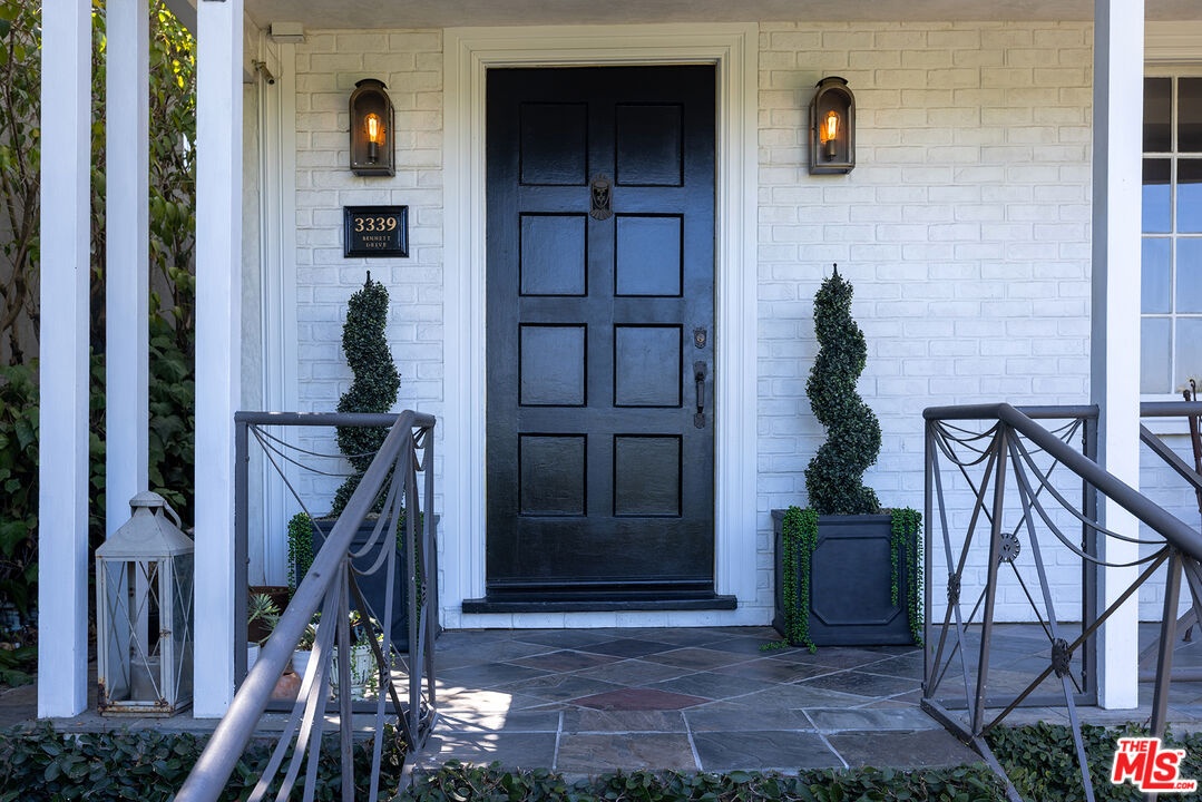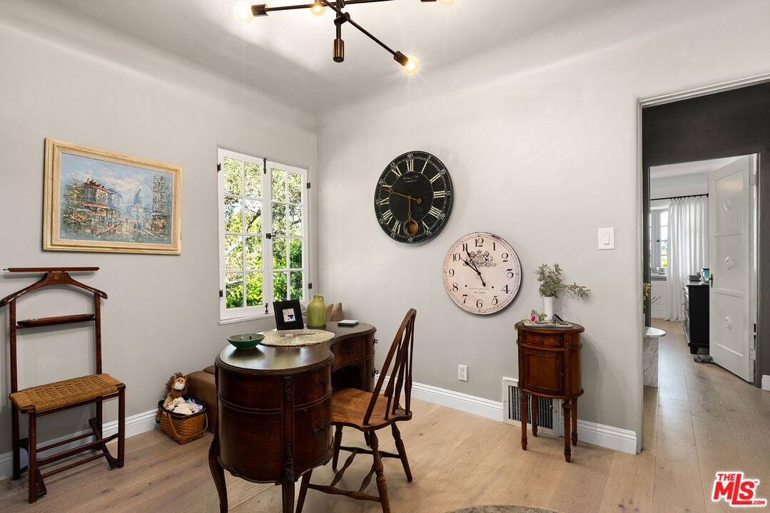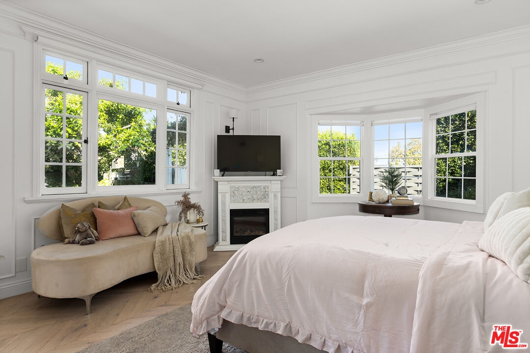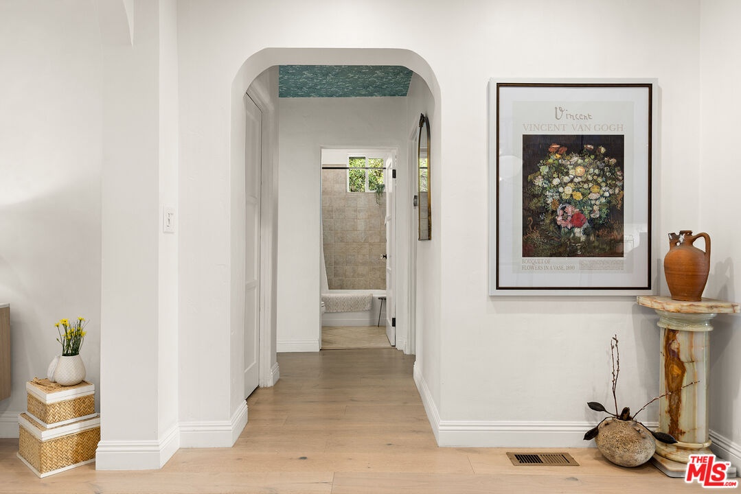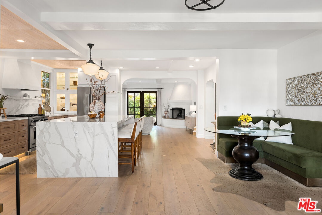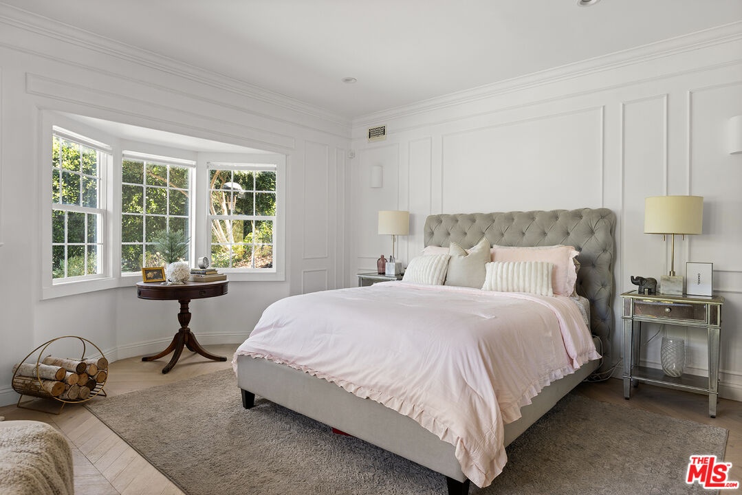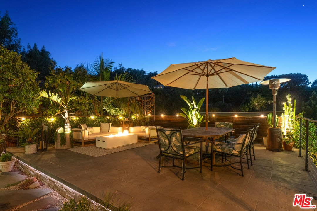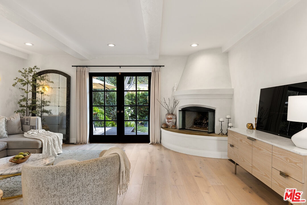 Nestled in the Hollywood Hills on a corner lot is this elegant 1934 traditional gated home surrounded by serene canyon vistas offering 4 bedrooms and 3 bathrooms with 2,352 of interior square footage spanning over two-stories. This sophisticated residence tastefully combines the modern conveniences of today and timeless old-world charm that will have you feeling like you're on a European getaway. Beamed ceilings, decorative archways, new hardwood floors, Mullion windows, original doors and imported hardware seamlessly meld together to create an alluring ambience. The main level is comprised of a reimagined open living space that includes a newly remodeled eat-in kitchen with an oversized waterfall island accommodating seating for four, top of the line stainless steel appliances including a wine fridge, wood paneled ceilings, custom lighting and pantry. Adjacent to the kitchen is an inviting den featuring an adobe fireplace, and French doors that open to lush gardens, meandering pathways, lily pad dotted pond, mature fruit trees, multiple seating and dining areas plus an expansive roof top deck perfect al fresco dining or hosting a lavish party under the stars on the magical sprawling grounds. All three guest bedrooms also on the main level are drenched in sunlight and enjoy beautiful vistas of the hills. The lower level offers its own separate entrance and consists entirely of a spacious primary suite with new Chevron white oak floors, a chic updated bathroom with dual vanity, separate shower and tub, a flexible office/sitting area, built-in vanity area and extra storage. Conveniently located near Universal Studios, the iconic Hollywood Bowl, hiking trails, popular restaurants and shops in both Studio City and Hollywood with several neighborhood eateries just blocks away. A detached three-car garage, hot tub and gated driveway with keypad security entrance complete this private Hollywood Hills oasis.