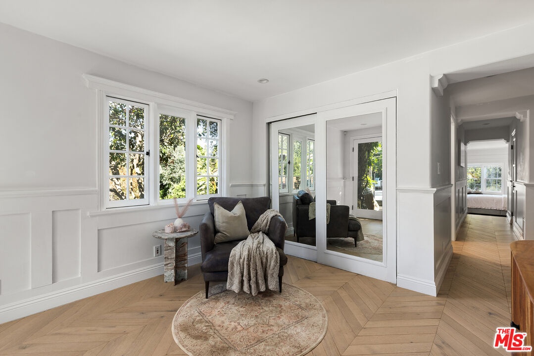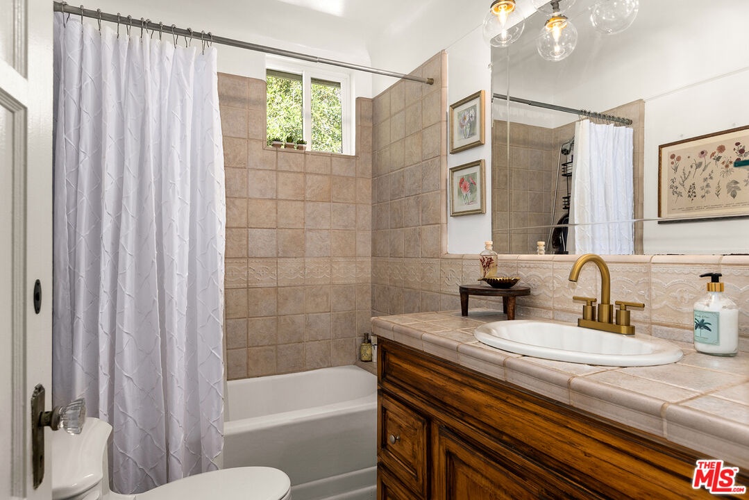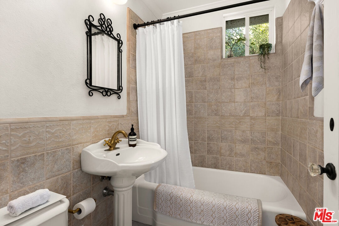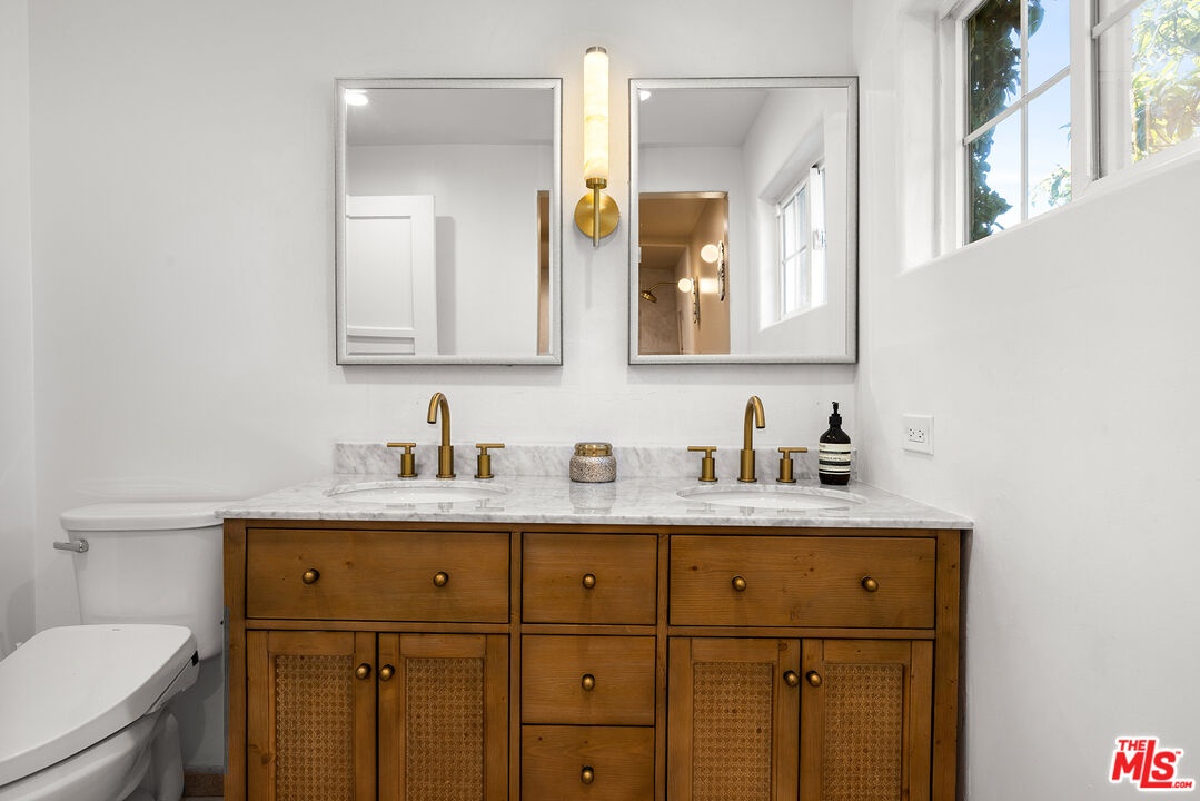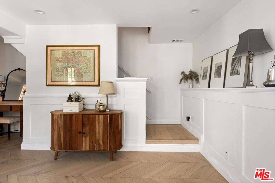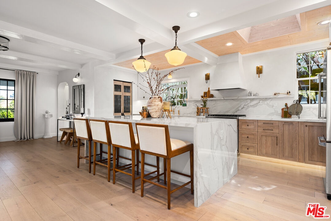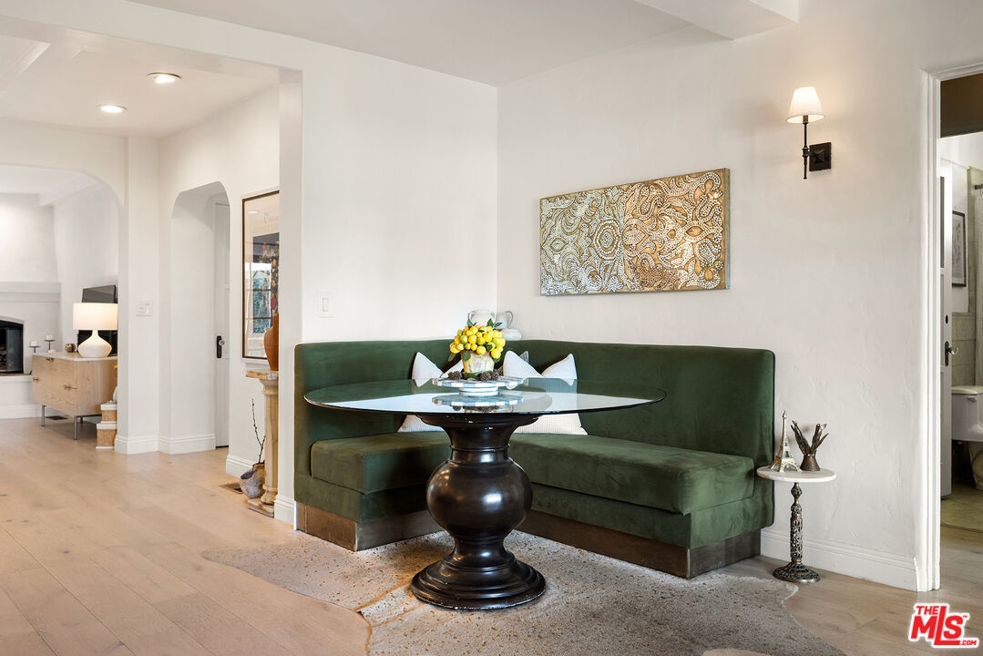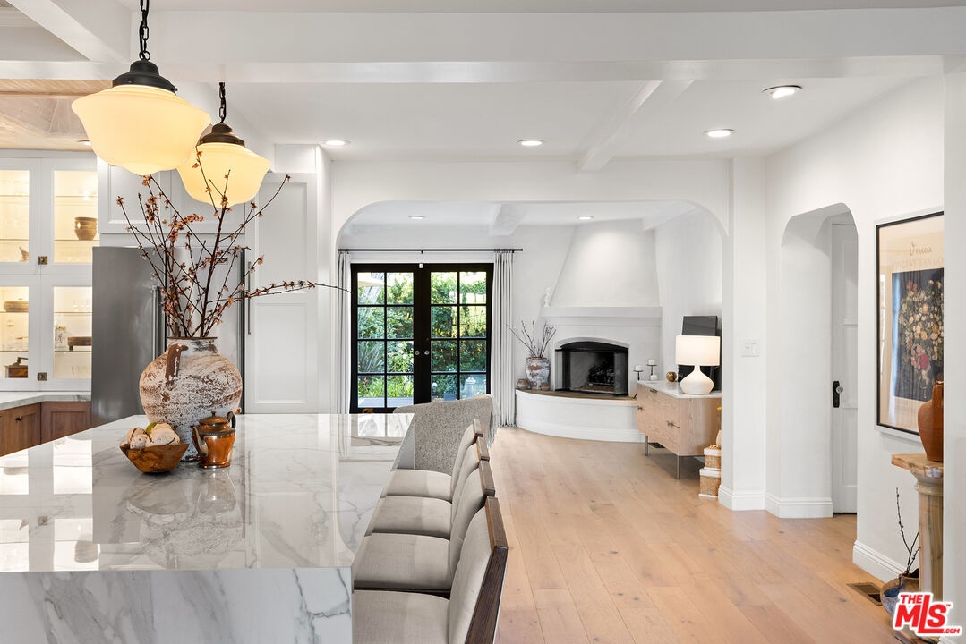 Nestled in the Hollywood Hills on a corner lot is this elegant 1934 traditional gated home surrounded by serene canyon vistas offering 4 bedrooms and 3 bathrooms with 2,352 of interior square footage spanning over two-stories. This sophisticated residence tastefully combines the modern conveniences of today and timeless old-world charm that will have you feeling like you're on a European getaway. Beamed ceilings, decorative archways, new hardwood floors, Mullion windows, original doors and imported hardware seamlessly meld together to create an alluring ambience. The main level is comprised of a reimagined open living space that includes a newly remodeled eat-in kitchen with an oversized waterfall island accommodating seating for four, top of the line stainless steel appliances including a wine fridge, wood paneled ceilings, custom lighting and pantry. Adjacent to the kitchen is an inviting den featuring an adobe fireplace, and French doors that open to lush gardens, meandering pathways, lily pad dotted pond, mature fruit trees, multiple seating and dining areas plus an expansive roof top deck perfect al fresco dining or hosting a lavish party under the stars on the magical sprawling grounds. All three guest bedrooms also on the main level are drenched in sunlight and enjoy beautiful vistas of the hills. The lower level offers its own separate entrance and consists entirely of a spacious primary suite with new Chevron white oak floors, a chic updated bathroom with dual vanity, separate shower and tub, a flexible office/sitting area, built-in vanity area and extra storage. Conveniently located near Universal Studios, the iconic Hollywood Bowl, hiking trails, popular restaurants and shops in both Studio City and Hollywood with several neighborhood eateries just blocks away. A detached three-car garage, hot tub and gated driveway with keypad security entrance complete this private Hollywood Hills oasis.