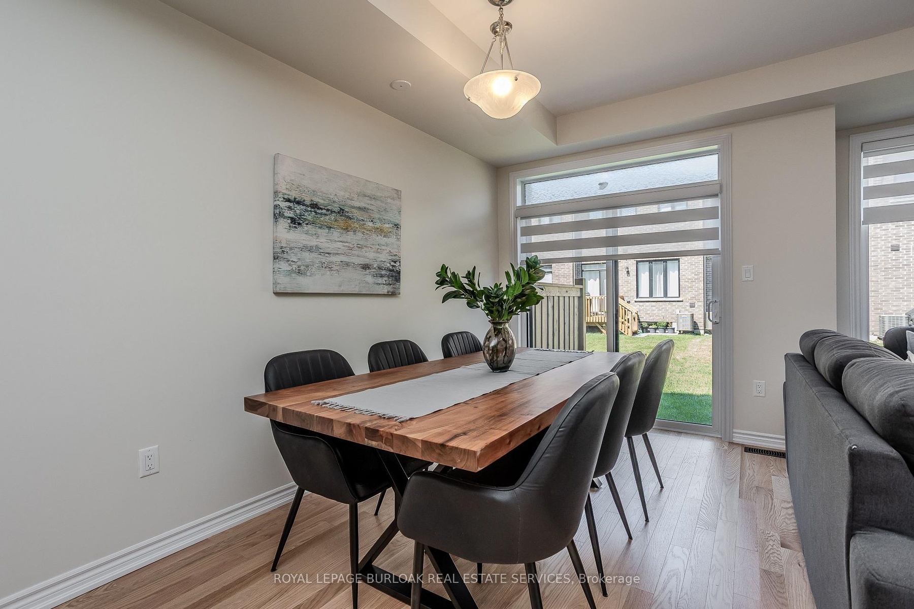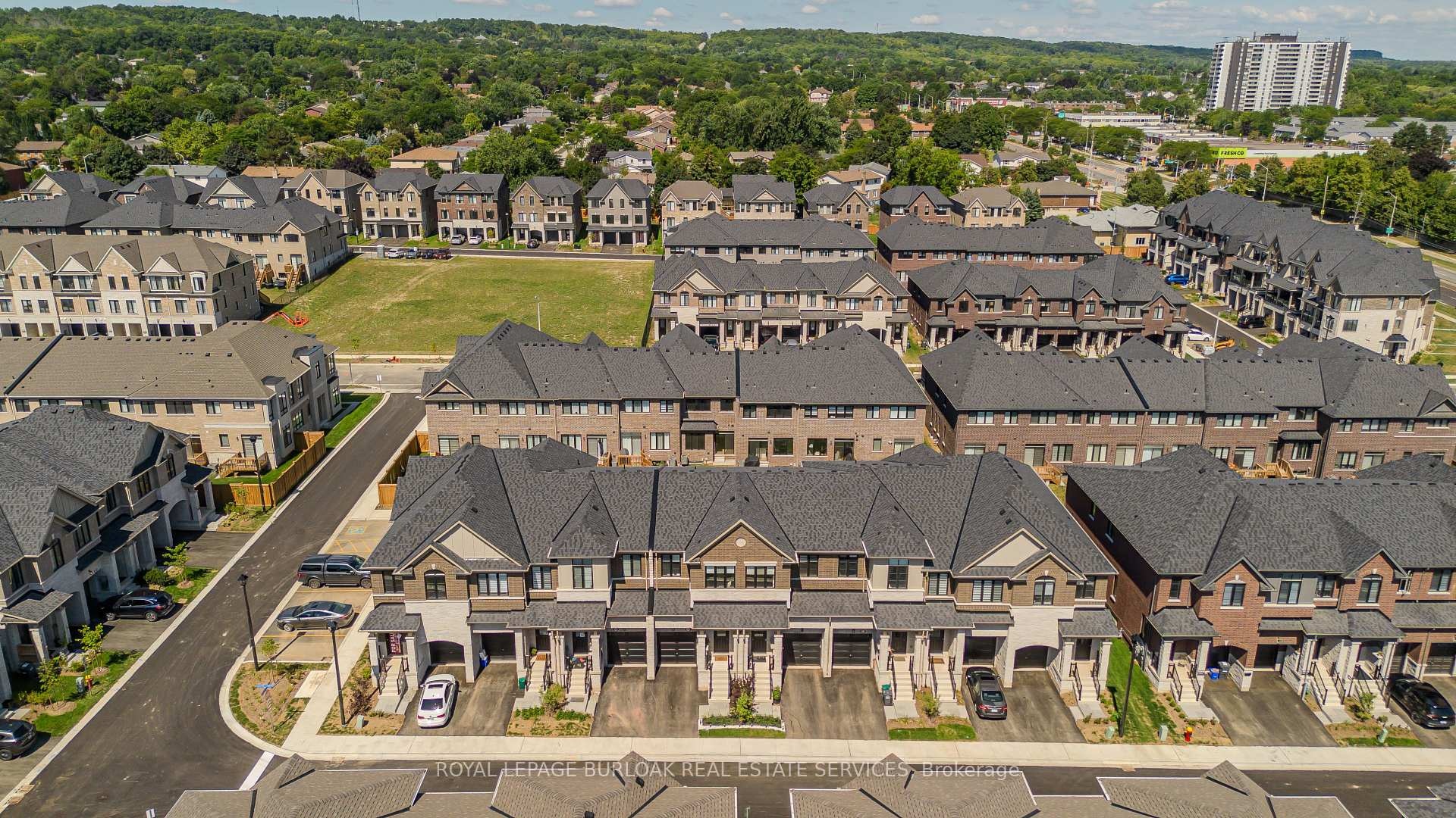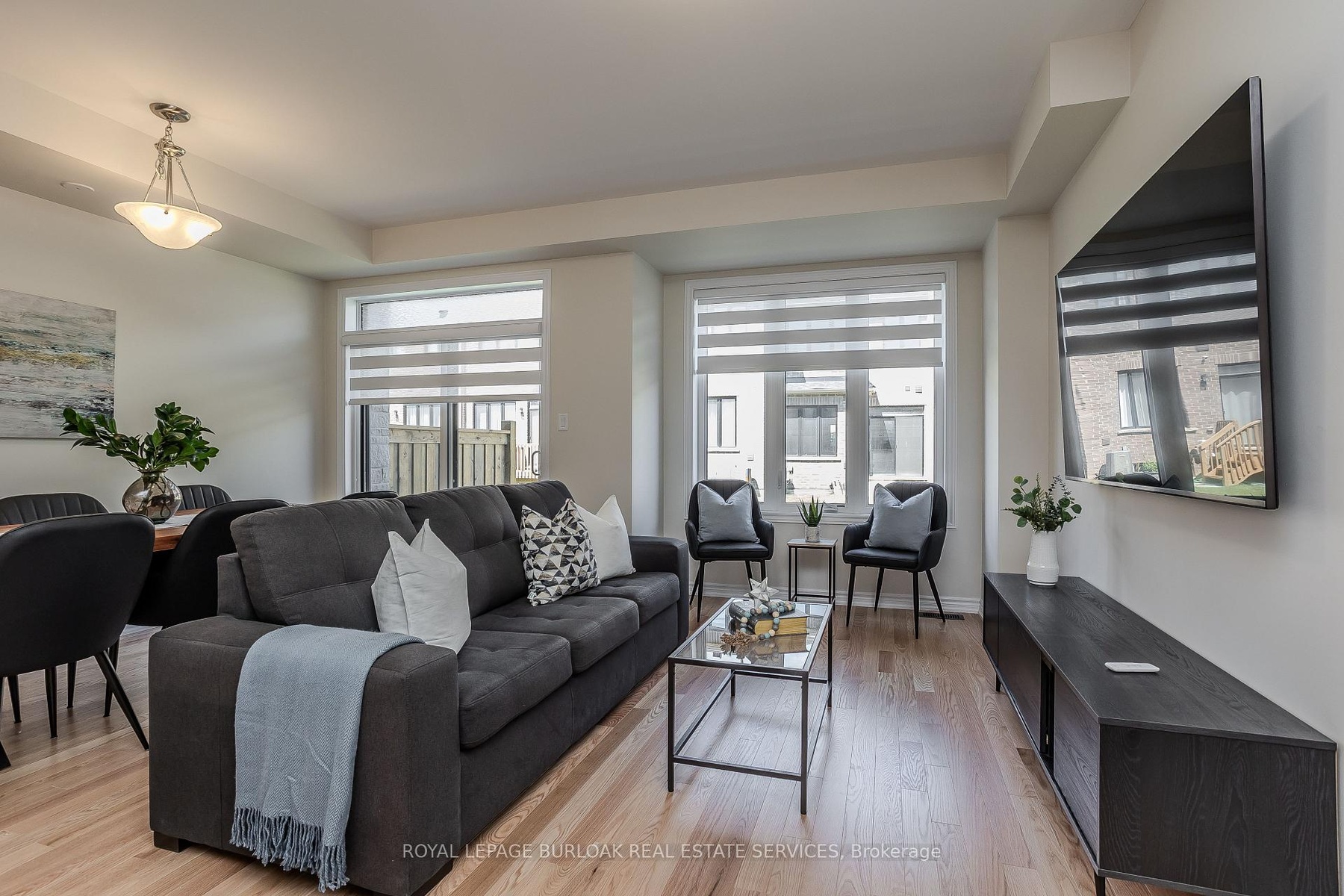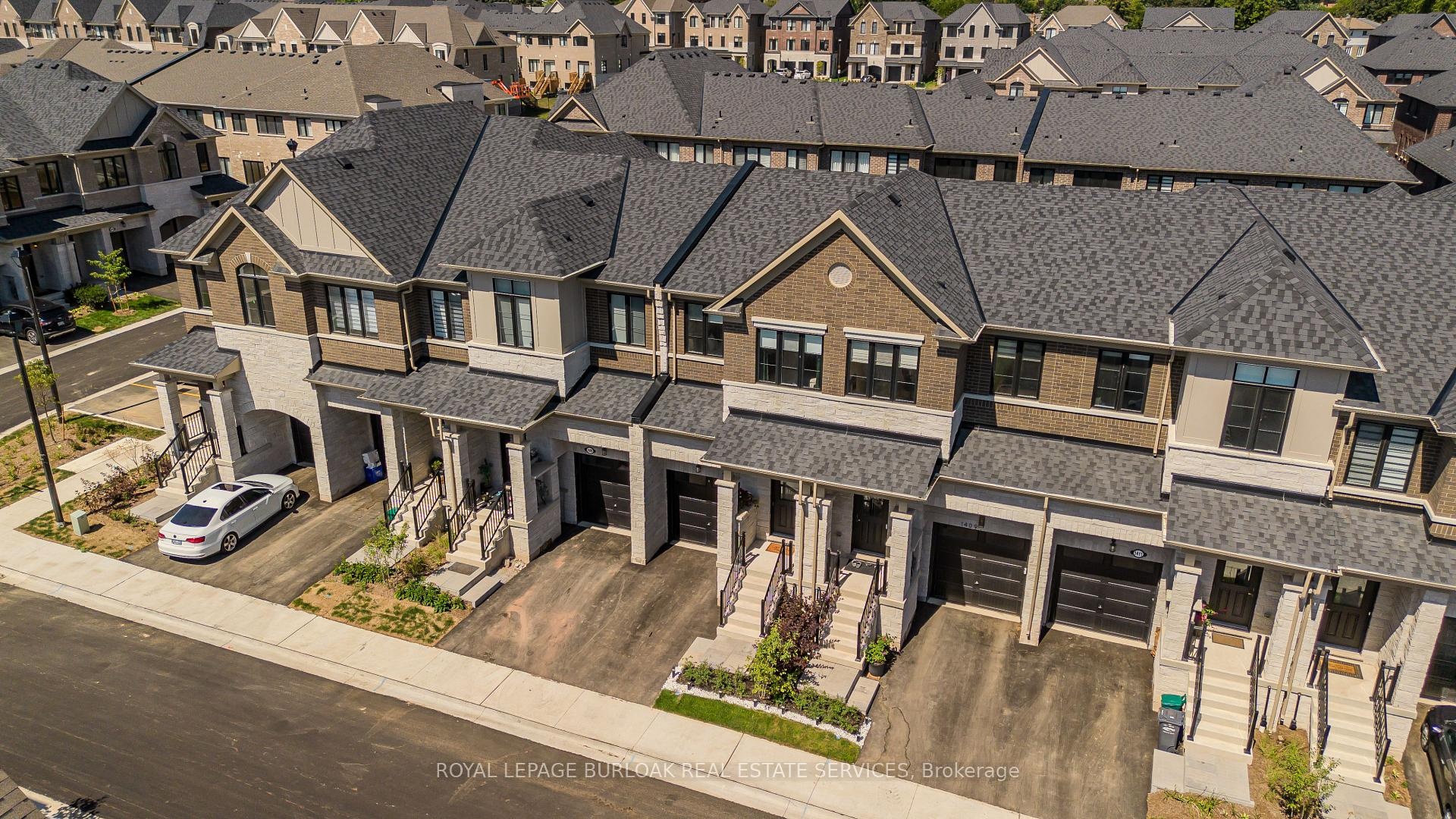 Welcome to this gorgeous brand-new modern freehold townhome by National Homes, situated in Burlington's sought-after Tyandaga community. Offering a balance of comfort and convenience, this home is steps away from shopping, amenities, golf, & more all daily needs within easy reach. From the moment you enter, you'll notice the thoughtful upgrades and stylish finishes that set this home apart. The freshly repainted interior (2025), and upgraded 12x24 foyer tiles, create a welcoming feel throughout. The main floor features an open-concept design filled with natural light, highlighted by hardwood flooring and motorized zebra blinds w/ remote control. The modern kitchen is designed for both function and family gatherings, complete with granite countertops, peninsula w/ breakfast bar, built-in workspace, and soft-close cabinetry. The bright dining and living areas seamlessly connect, with a walkout to the backyard perfect for summer BBQs, or simply relaxing. Upstairs, families will love the convenient laundry room. The primary bedroom offers a calming escape, featuring a walk-in closet and a spa-like 4pc ensuite with a glass walk-in shower and freestanding tub. Two additional well-sized bedrooms provide plenty of room to grow, with a 4pc bathroom with modern fixtures close by. Blackout roller shades ensure comfort and privacy throughout the second level, creating restful spaces for both parents and children. Unfinished basement offers abundant storage or future living space. The exterior is equally impressive, with energy-efficient Panergy panels (15% Less Energy Cost), a garage boasting 13ft ceilings, and a spacious backyard. Located just minutes from GO Transit, QEW, Hwy 407, top-rated schools, recreational facilities, trails, and Tyandaga golf course, with a community park coming soon. Stylish, practical, and move-in ready, this home checks all the boxes for families who want both modern upgrades and a welcoming community lifestyle.