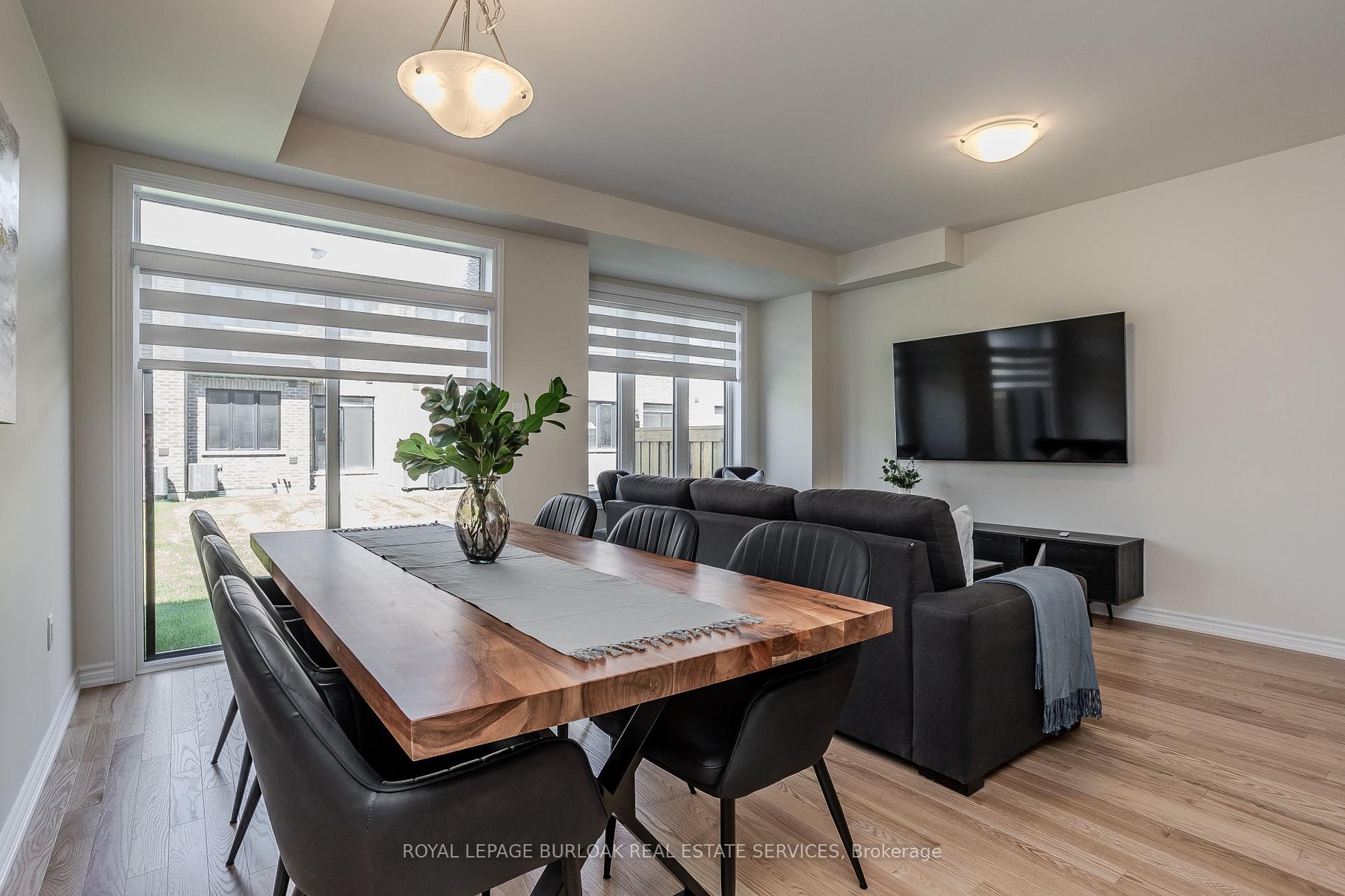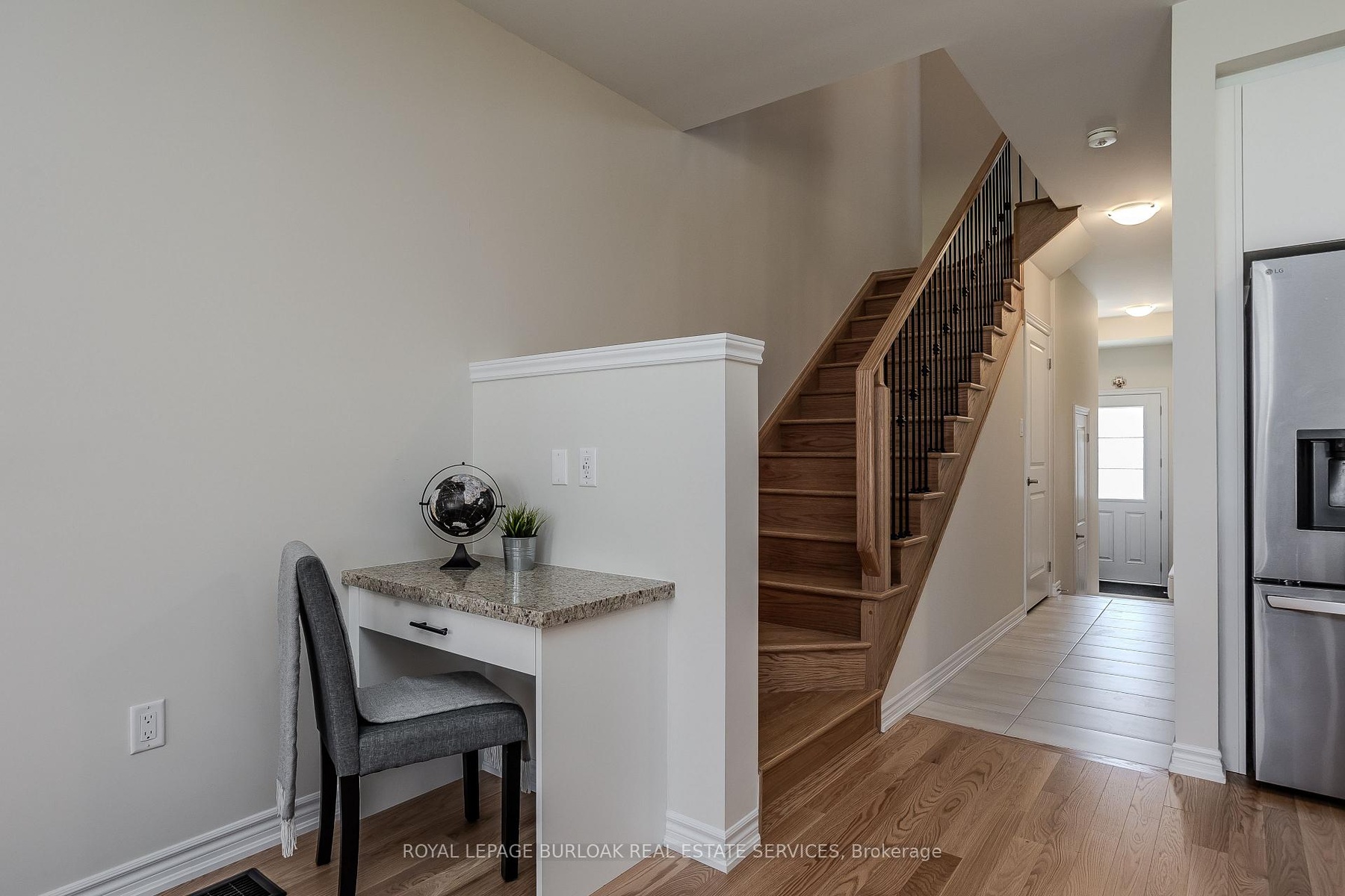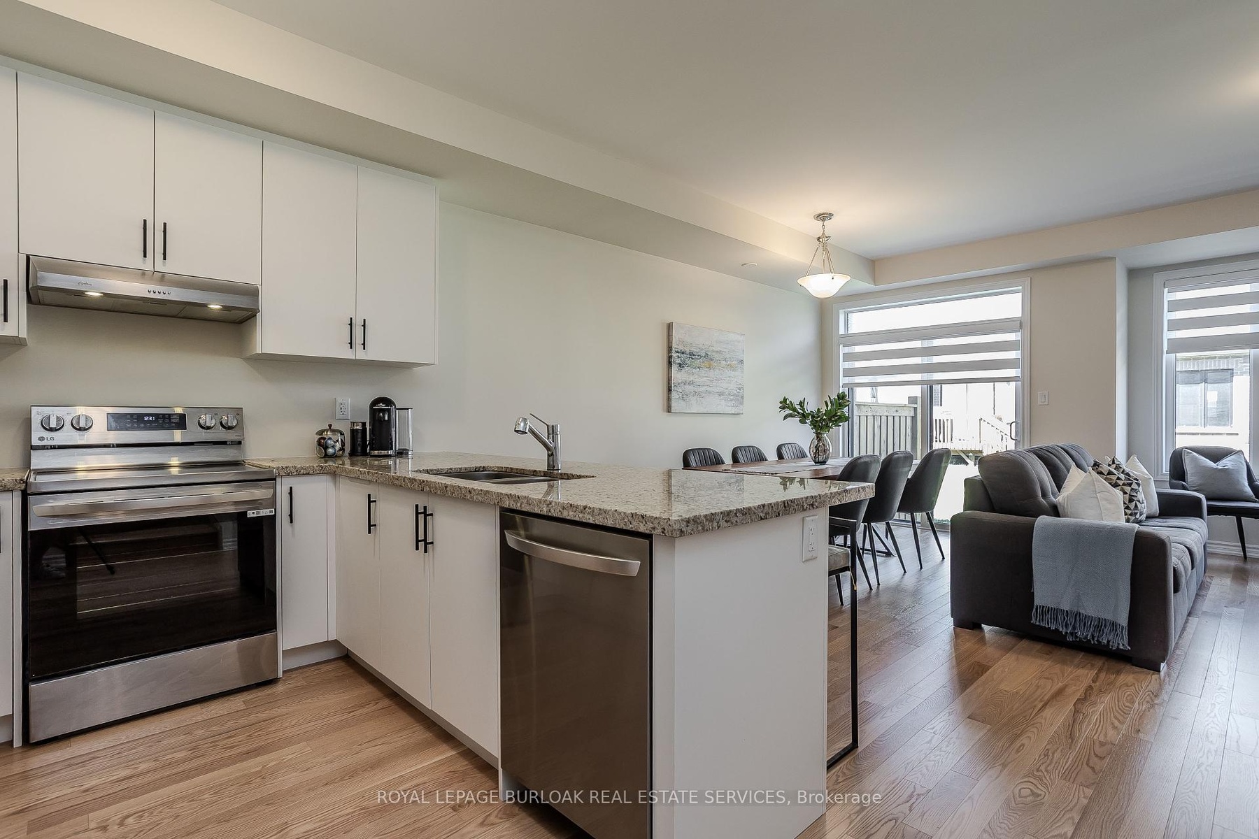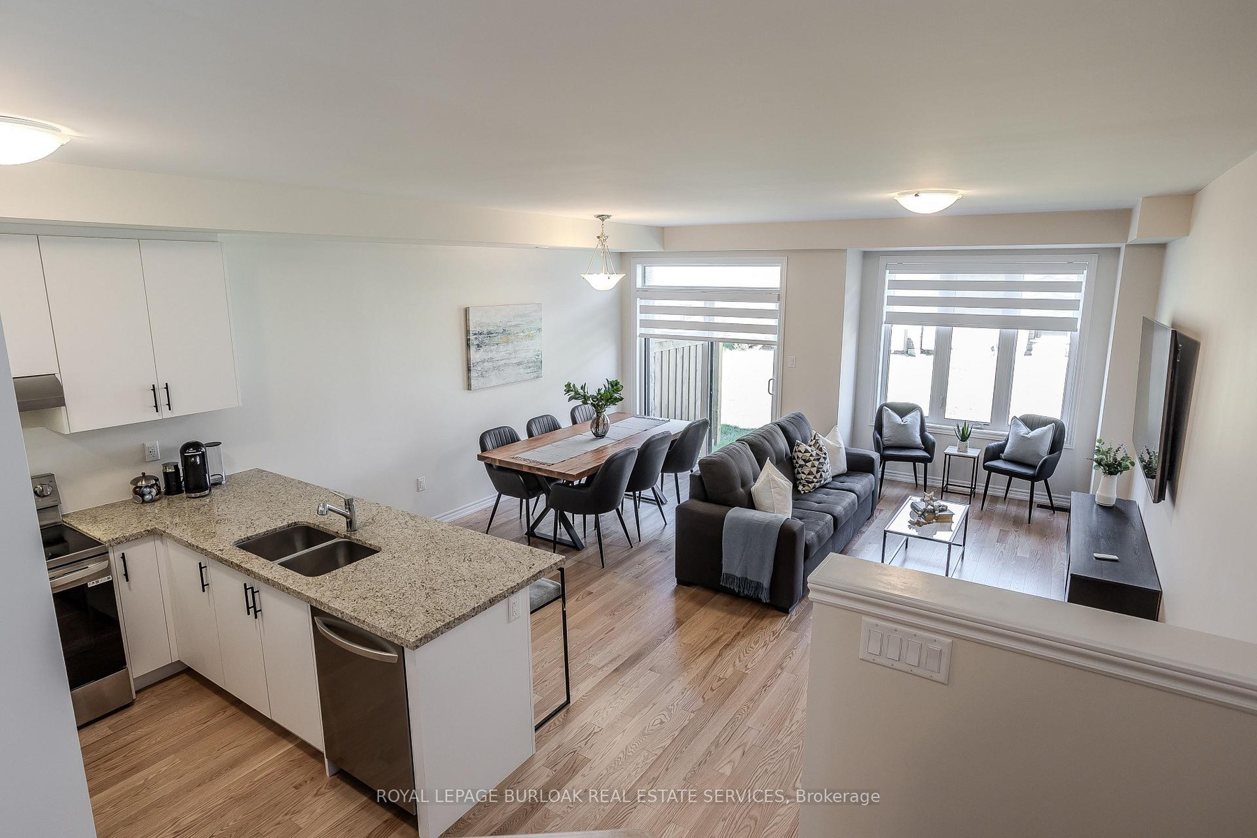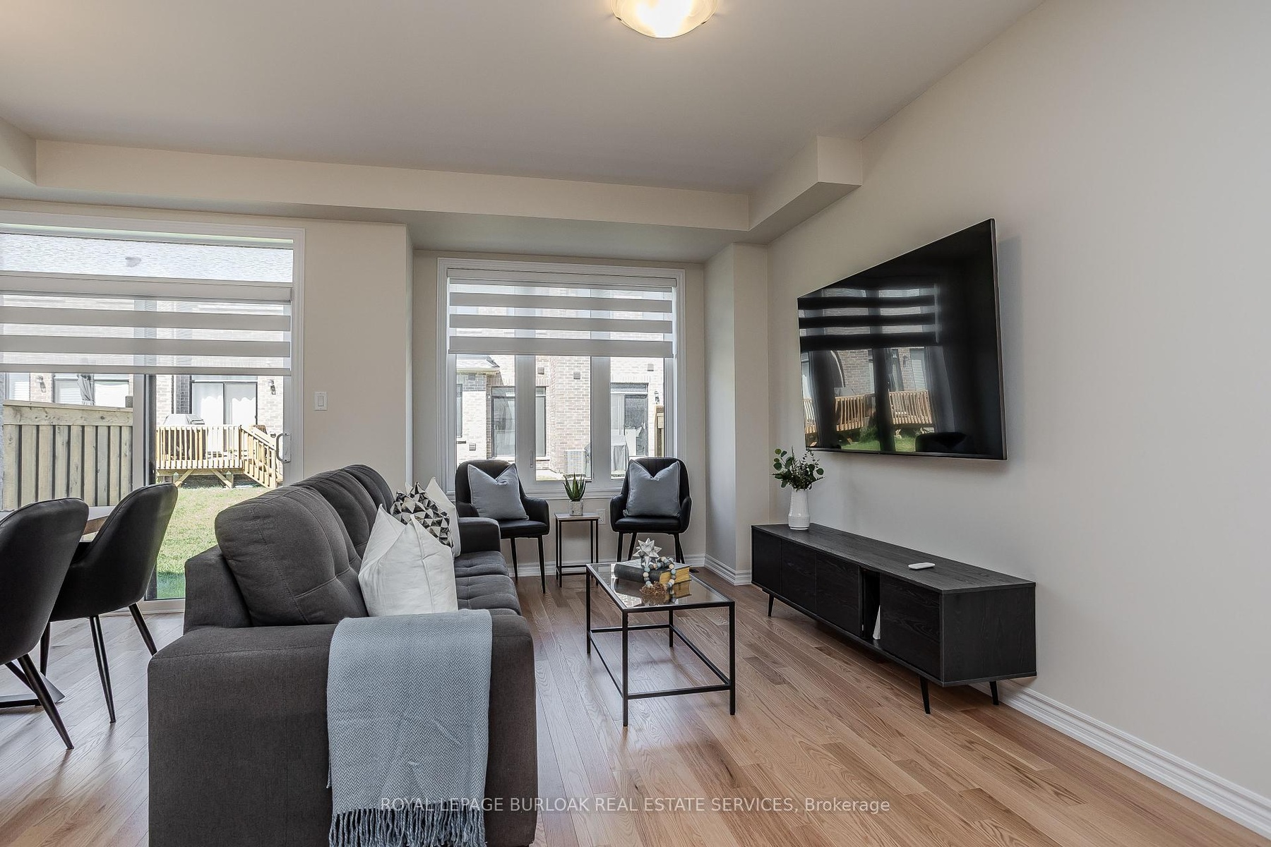 Welcome to this gorgeous brand-new modern freehold townhome by National Homes, situated in Burlington's sought-after Tyandaga community. Offering a balance of comfort and convenience, this home is steps away from shopping, amenities, golf, & more all daily needs within easy reach. From the moment you enter, you'll notice the thoughtful upgrades and stylish finishes that set this home apart. The freshly repainted interior (2025), and upgraded 12x24 foyer tiles, create a welcoming feel throughout. The main floor features an open-concept design filled with natural light, highlighted by hardwood flooring and motorized zebra blinds w/ remote control. The modern kitchen is designed for both function and family gatherings, complete with granite countertops, peninsula w/ breakfast bar, built-in workspace, and soft-close cabinetry. The bright dining and living areas seamlessly connect, with a walkout to the backyard perfect for summer BBQs, or simply relaxing. Upstairs, families will love the convenient laundry room. The primary bedroom offers a calming escape, featuring a walk-in closet and a spa-like 4pc ensuite with a glass walk-in shower and freestanding tub. Two additional well-sized bedrooms provide plenty of room to grow, with a 4pc bathroom with modern fixtures close by. Blackout roller shades ensure comfort and privacy throughout the second level, creating restful spaces for both parents and children. Unfinished basement offers abundant storage or future living space. The exterior is equally impressive, with energy-efficient Panergy panels (15% Less Energy Cost), a garage boasting 13ft ceilings, and a spacious backyard. Located just minutes from GO Transit, QEW, Hwy 407, top-rated schools, recreational facilities, trails, and Tyandaga golf course, with a community park coming soon. Stylish, practical, and move-in ready, this home checks all the boxes for families who want both modern upgrades and a welcoming community lifestyle.