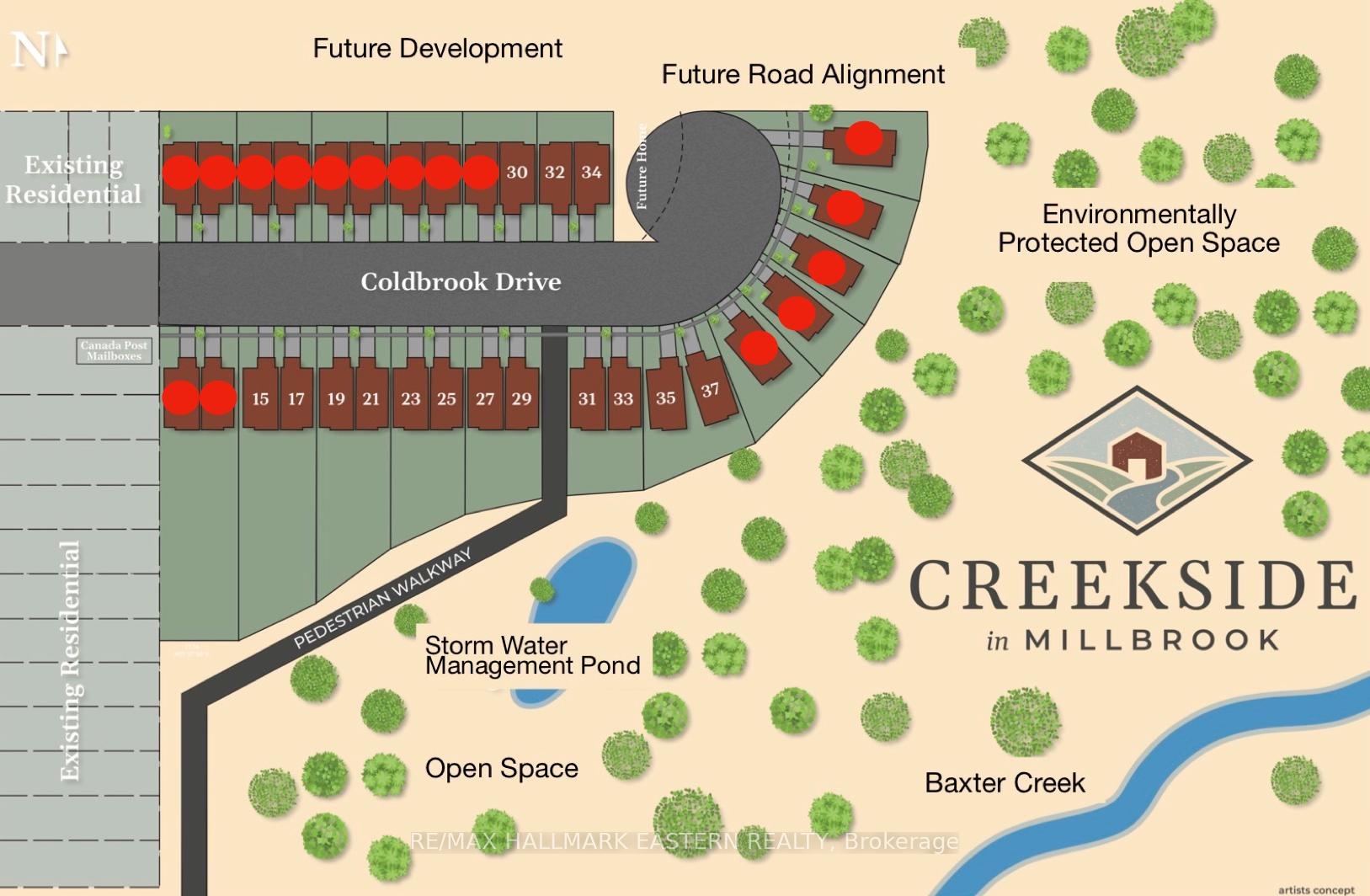 Quality Built New Home on premium lot backing on to environmentally protected greenspace, the "Claremount", (Elevation A), with separate entrance walk-out basement offers multigenerational living or accessory apartment income in "Creekside in Millbrook", a small cul-de-sac enclave of new homes on parkland within the historic limits of the Village, close to the School and Daycare. Unique to this model is a second storey Family Room featuring a cathedral ceiling and gas fireplace. This is 1954 square feet of beautifully finished living space plus attached 2 car garage and unfinished basement with rough in for a 4th bath. The main floor has engineered hardwood flooring, 9 foot troweled ceilings, Den or formal dining room off the Living Area and open-concept quartz countered kitchen with pantry cabinetry, breakfast bar and walkout to deck overlooking the forest. Many upgraded features are included by Millbrook's most trusted builder, the Veltri Group. Open houses are Saturdays and Sundays, 1 pm to 4 pm except for October 12.