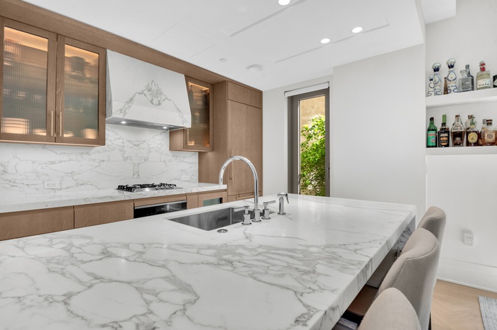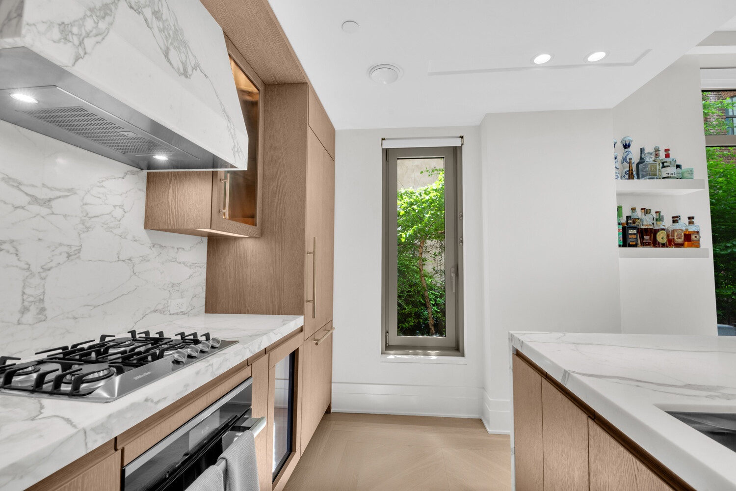 At the heart of the residence is a stunning kitchen by Ryan Korban, anchored by a statuary marble island with matching countertops, backsplash, and a dramatic book-matched marble hood. Italian cerused oak cabinetry is paired with fluted bronze glass and custom SA Baxter burnished nickel hardware, all enhanced by a full suite of premium Miele appliances.