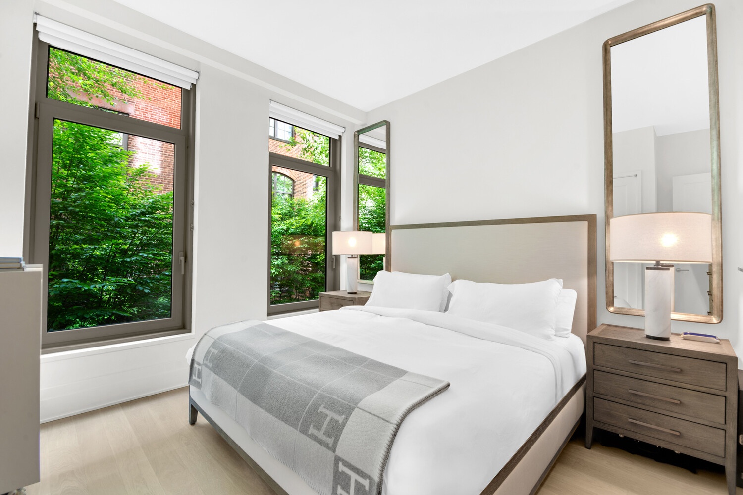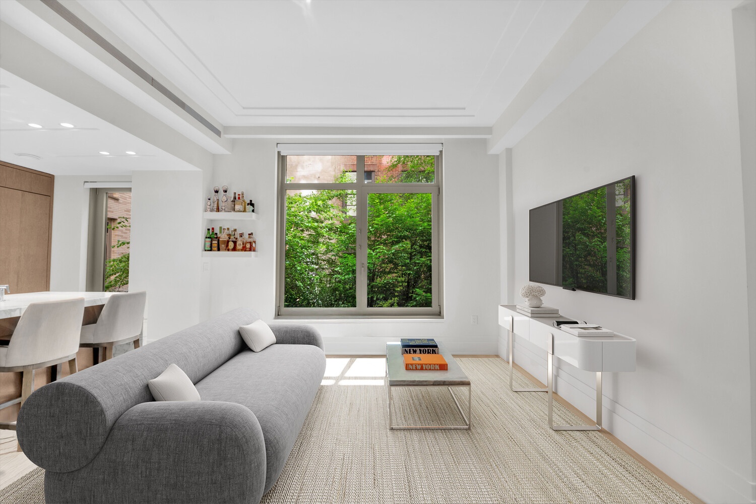 Residence 3H is a beautifully appointed one-bedroom home where timeless design meets modern luxury. Soaring 10-foot coved ceilings and oversized east-facing windows fill the space with natural light and frame serene views of the lush landscaped garden.
