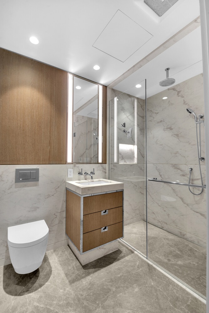 The bedroom provides a tranquil retreat, while the spa-like bathroom showcases honed Grigio Dove stone, custom cerused oak paneling, and Lefroy Brooks polished chrome fixtures - a refined palette elevated by mirrors and glass that maximize light and depth. Additional conveniences include a discreet laundry area with an LG washer and dryer, and private storage that accompanies the home.
