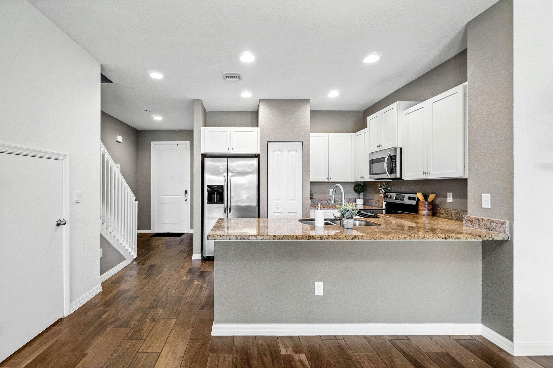 Welcome to this stylish waterfront home, built by D.R. Horton in 2017! This residence combines modern design with move-in-ready comfort. The upgraded kitchen boasts sleek finishes and stainless steel appliances, opening to a bright living area with hardwood floors and abundant natural light. The primary suite offers a fully renovated bathroom with a walk-in shower, designer tile, and premium fixtures. All bedrooms are generously sized with ample storage, and the in-unit washer and dryer add everyday convenience. Step outside to a private patio with tranquil water and fountain views, perfect for relaxing or entertaining. Ideally located near shopping, dining, and major highways, this home blends style, low-maintenance living, and a desirable waterfront lifestyle!