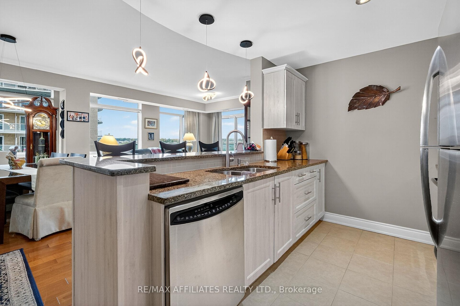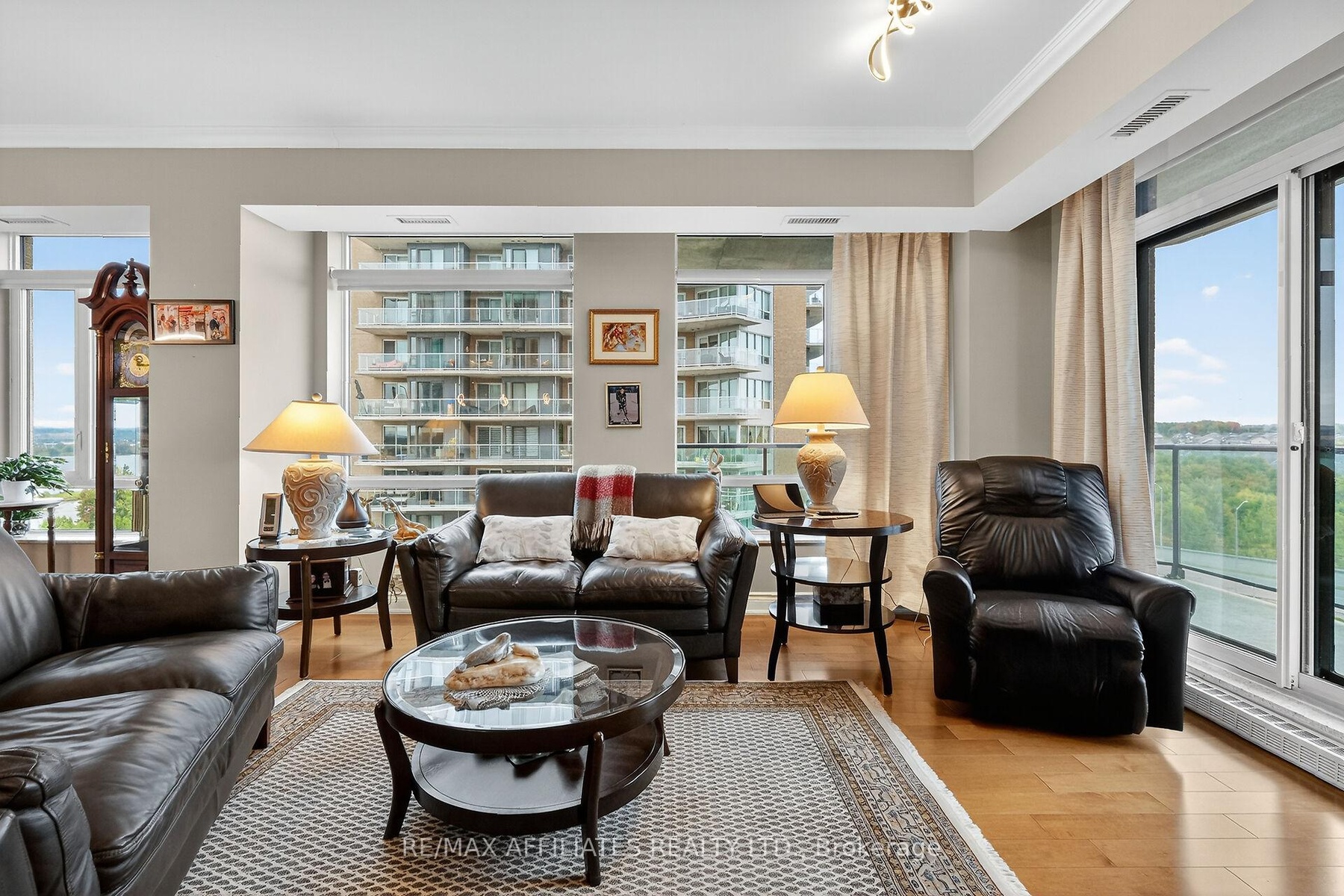 Stunning 2 Bed, 2 Bath Corner Unit with Spectacular Views! Enjoy panoramic views of the Ottawa River, Petrie Island, and both east & south exposures from this 9th-floor corner condo with a large wraparound balcony. This move-in-ready 2 bed, 2 bath unit features an updated kitchen with granite counters, LED lighting, and a microwave hood fan. Beautiful hardwood floors in the open-concept living/dining areas, complete with electric fireplace and wall-mounted TV. Spacious primary bedroom offers a walk-in closet and 4-pc ensuite with granite vanity, separate shower, and tile flooring. Second bedroom also features hardwood and a double closet. 2nd bathroom with granite counter top. Tile entry with double closet, in-unit laundry/storage. Includes 1 underground parking space and large private locker. Well-managed building with gym, party room, and outdoor BBQ/lounge area. Steps to Ottawa River trails, close to shopping, transit, and more!