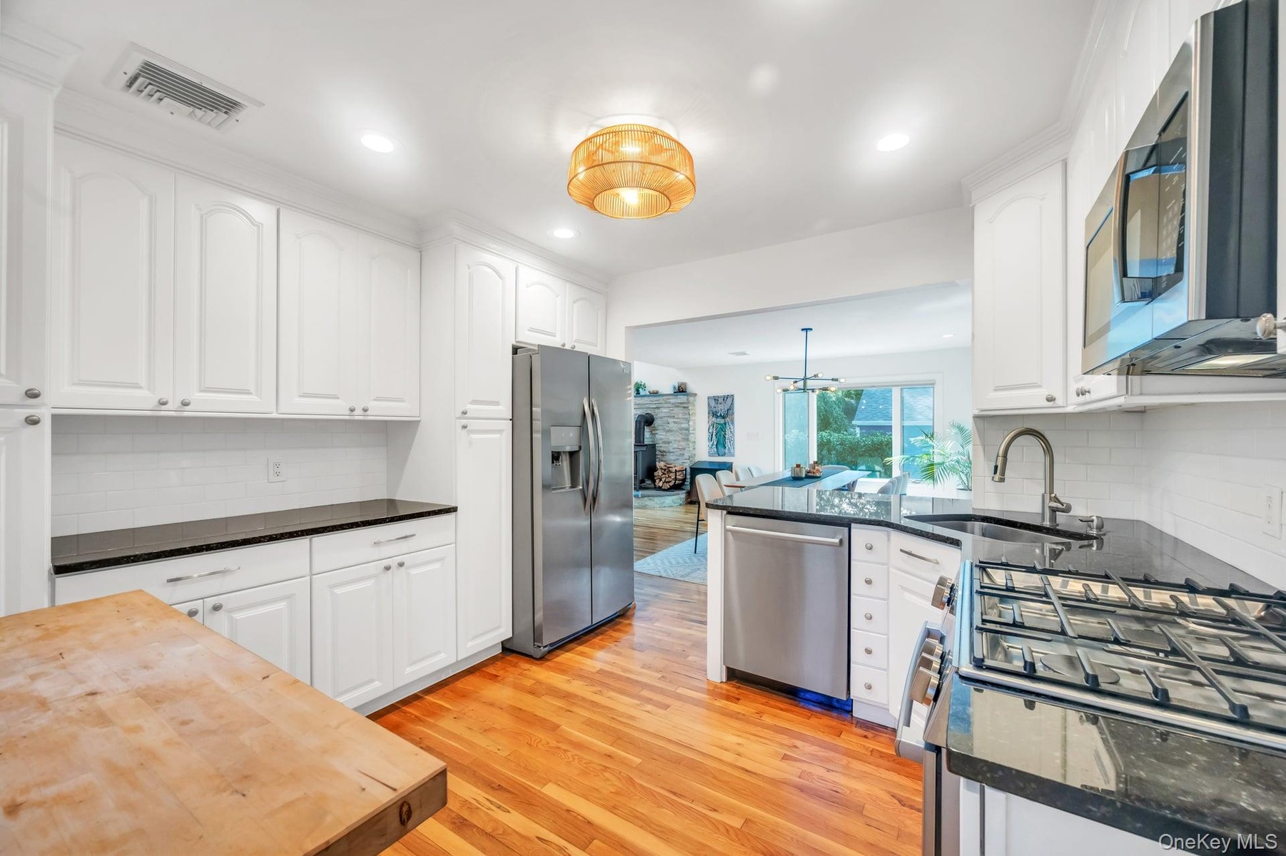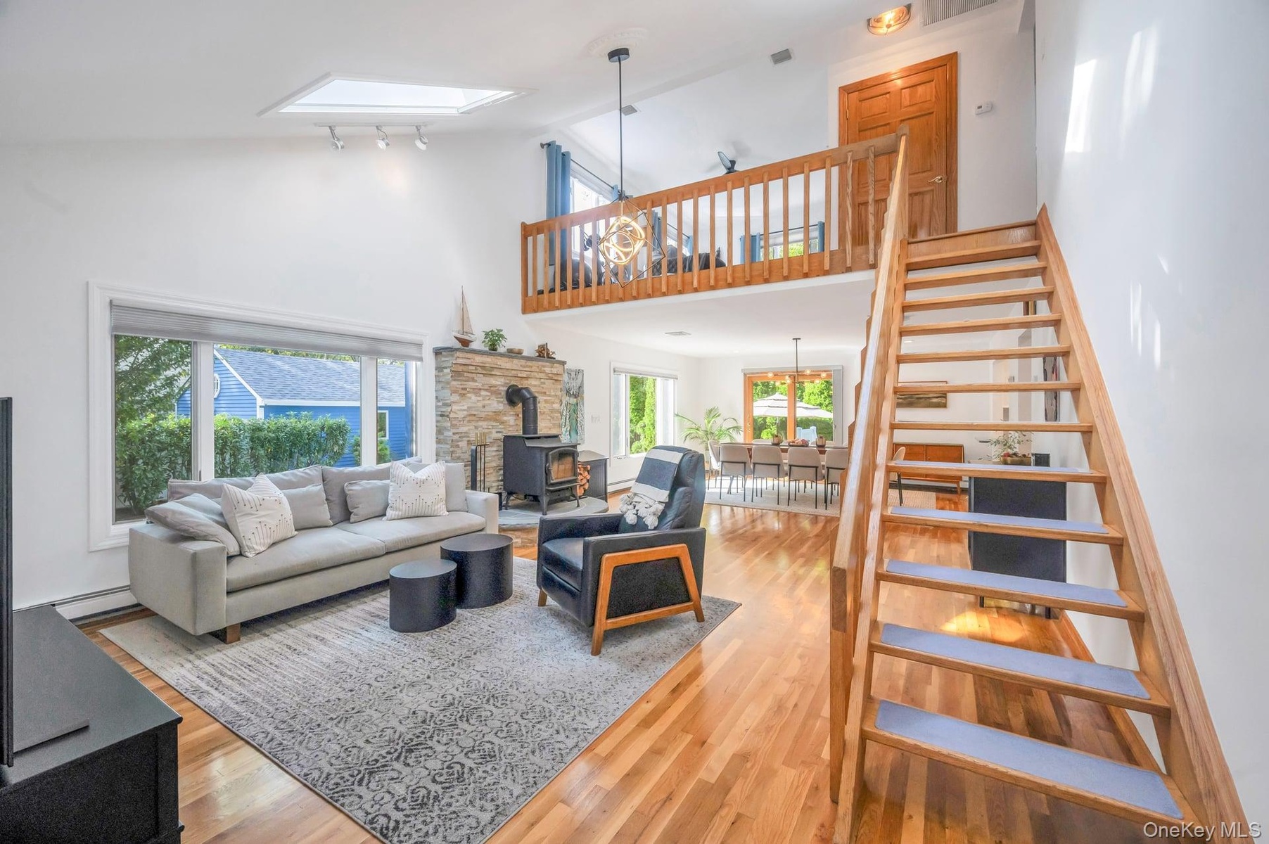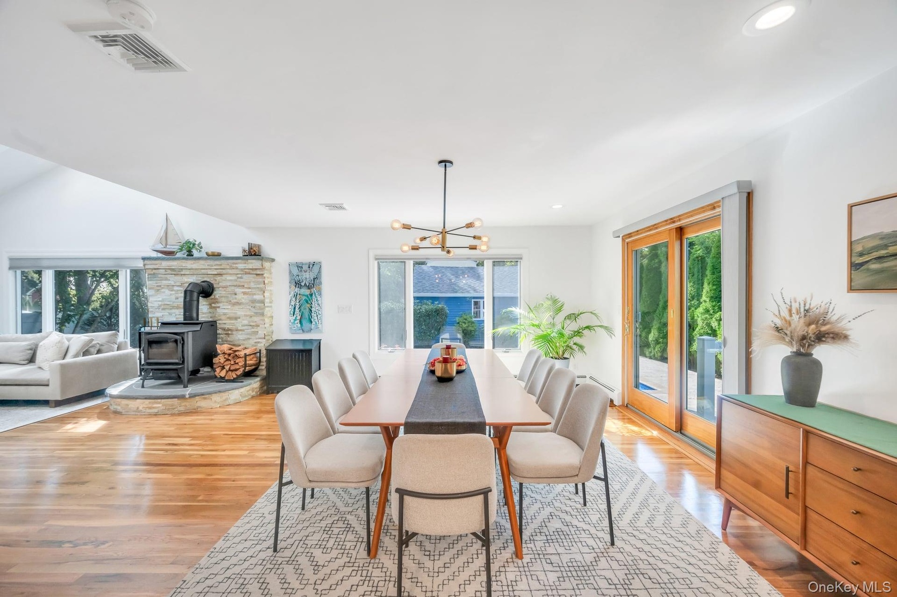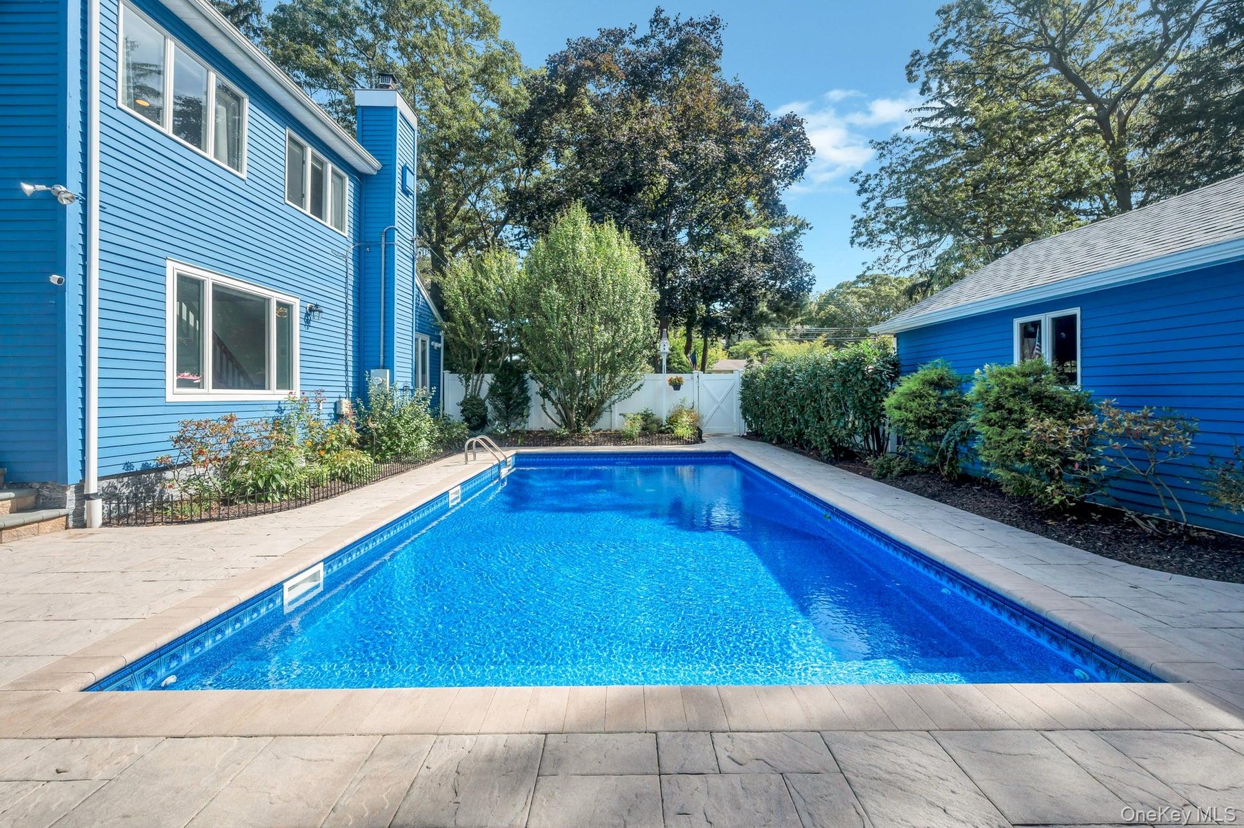 Incredible opportunity to own a magnificent newer-built home boasting a two-year-old roof, setback on the property with mature landscaping that creates privacy and seclusion from the moment you arrive. A long blacktop driveway with a Belgian block border leads to a two-car detached garage with electric, one large garage door, and white PVC fencing framing the grounds. The front approach is highlighted by a custom paver porch and beautiful cultured stone skirt wrapping the home, setting the tone for what’s inside and out. The backyard is a true resort, featuring an enormous paver patio, heated saltwater inground pool, multiple entertaining spaces, a portion of the yard finished with Astroturf for low-maintenance beauty while the front yard remains lush grass, and several entrances into the home for seamless indoor-outdoor living. The pool is perfectly positioned between the house and garage, creating a tranquil, private oasis. Inside, a brand-new white front door with glass top opens into a dramatic two-story grand entry with soaring vaulted ceilings, recessed lighting, and oversized windows that fill the space with natural light. The formal living room is centered around a one-year-old Lopi Endeavor wood-burning stove set against a cultured stone wall, while the formal dining room is highlighted by a modern nine-bulb chandelier and a huge slider leading directly to the rear yard. The chef’s kitchen is outfitted with white cabinetry, granite countertops, stainless steel Bosch stove and dishwasher, stainless steel refrigerator with water and ice, subway tile backsplash, and a breakfast bar, all flowing seamlessly into a brand-new mudroom complete with LG front-loading washer and dryer, white cabinetry, hanging storage, and yet another access point to the backyard. The first floor offers one bedroom, making it ideal for a home office, out-of-town guests, or extended family, along with a full bath featuring floor-to-ceiling tile, a glass stand-up shower, and modern fixtures. Upstairs you’ll find a versatile den/bonus room or additional bedroom with updated hardwood floors and ceiling fan, plus an incredible primary suite with ceiling fan and a brand-new spa-like bath with glass tub and shower with built-in soap niches, custom tile flooring, and white vanity. A spacious additional bedroom with new flooring and a six-panel fog glass closet door rounds out the second floor. This home is packed with upgrades including 200-amp electrical service, Andersen windows, a less than one-year-old high-efficiency boiler, propane cooking, a separate cesspool and dry well, and a five-zone inground sprinkler system. Truly one-of-a-kind, this property combines modern finishes, meticulous updates, resort-style outdoor living, and every high-end feature today’s buyer could want.