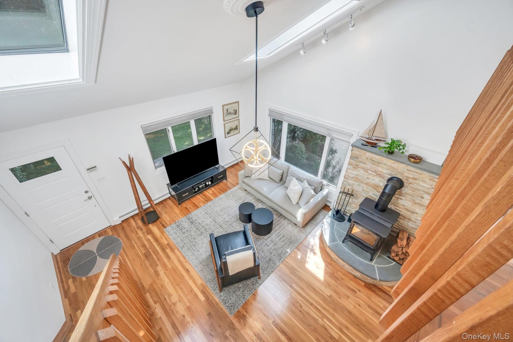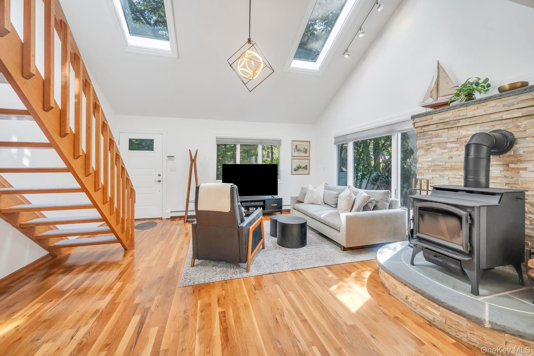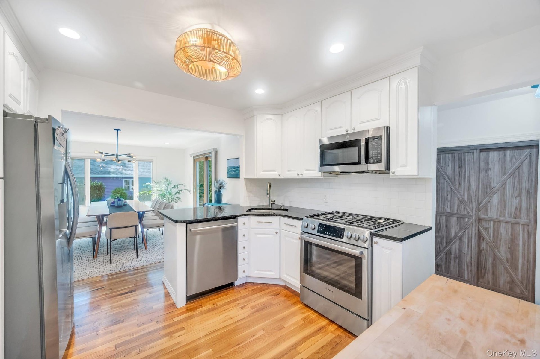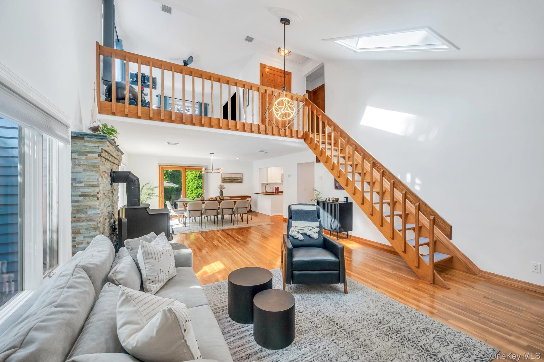 Incredible opportunity to own a magnificent newer-built home boasting a two-year-old roof, setback on the property with mature landscaping that creates privacy and seclusion from the moment you arrive. A long blacktop driveway with a Belgian block border leads to a two-car detached garage with electric, one large garage door, and white PVC fencing framing the grounds. The front approach is highlighted by a custom paver porch and beautiful cultured stone skirt wrapping the home, setting the tone for what’s inside and out. The backyard is a true resort, featuring an enormous paver patio, heated saltwater inground pool, multiple entertaining spaces, a portion of the yard finished with Astroturf for low-maintenance beauty while the front yard remains lush grass, and several entrances into the home for seamless indoor-outdoor living. The pool is perfectly positioned between the house and garage, creating a tranquil, private oasis. Inside, a brand-new white front door with glass top opens into a dramatic two-story grand entry with soaring vaulted ceilings, recessed lighting, and oversized windows that fill the space with natural light. The formal living room is centered around a one-year-old Lopi Endeavor wood-burning stove set against a cultured stone wall, while the formal dining room is highlighted by a modern nine-bulb chandelier and a huge slider leading directly to the rear yard. The chef’s kitchen is outfitted with white cabinetry, granite countertops, stainless steel Bosch stove and dishwasher, stainless steel refrigerator with water and ice, subway tile backsplash, and a breakfast bar, all flowing seamlessly into a brand-new mudroom complete with LG front-loading washer and dryer, white cabinetry, hanging storage, and yet another access point to the backyard. The first floor offers one bedroom, making it ideal for a home office, out-of-town guests, or extended family, along with a full bath featuring floor-to-ceiling tile, a glass stand-up shower, and modern fixtures. Upstairs you’ll find a versatile den/bonus room or additional bedroom with updated hardwood floors and ceiling fan, plus an incredible primary suite with ceiling fan and a brand-new spa-like bath with glass tub and shower with built-in soap niches, custom tile flooring, and white vanity. A spacious additional bedroom with new flooring and a six-panel fog glass closet door rounds out the second floor. This home is packed with upgrades including 200-amp electrical service, Andersen windows, a less than one-year-old high-efficiency boiler, propane cooking, a separate cesspool and dry well, and a five-zone inground sprinkler system. Truly one-of-a-kind, this property combines modern finishes, meticulous updates, resort-style outdoor living, and every high-end feature today’s buyer could want.
