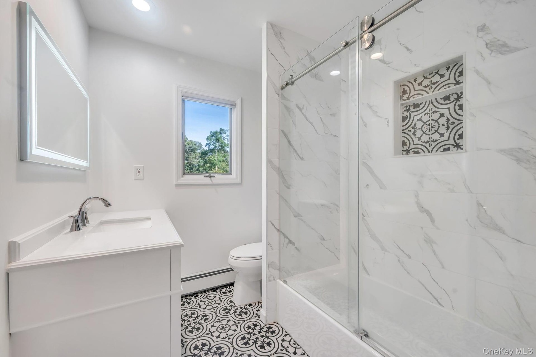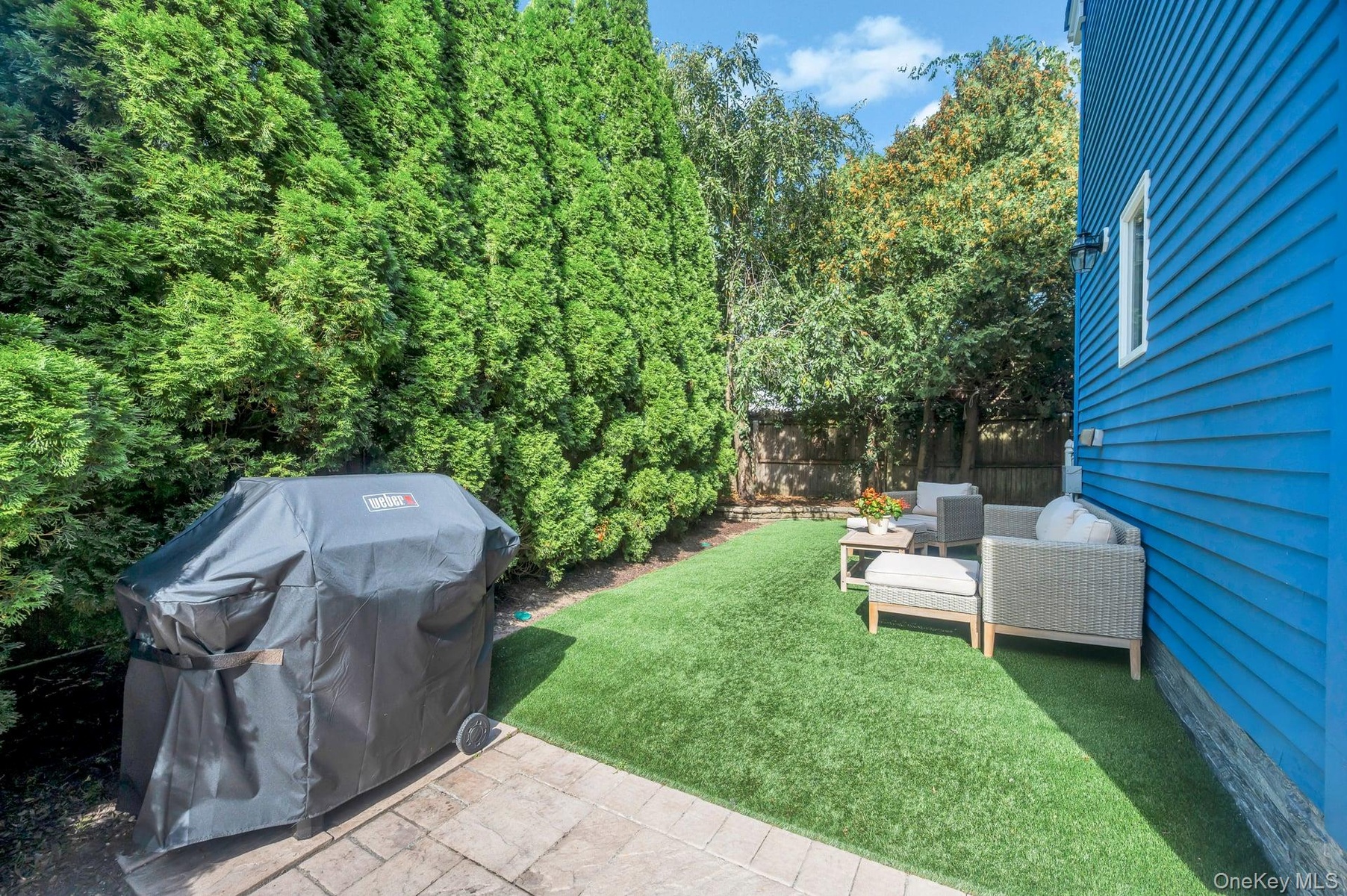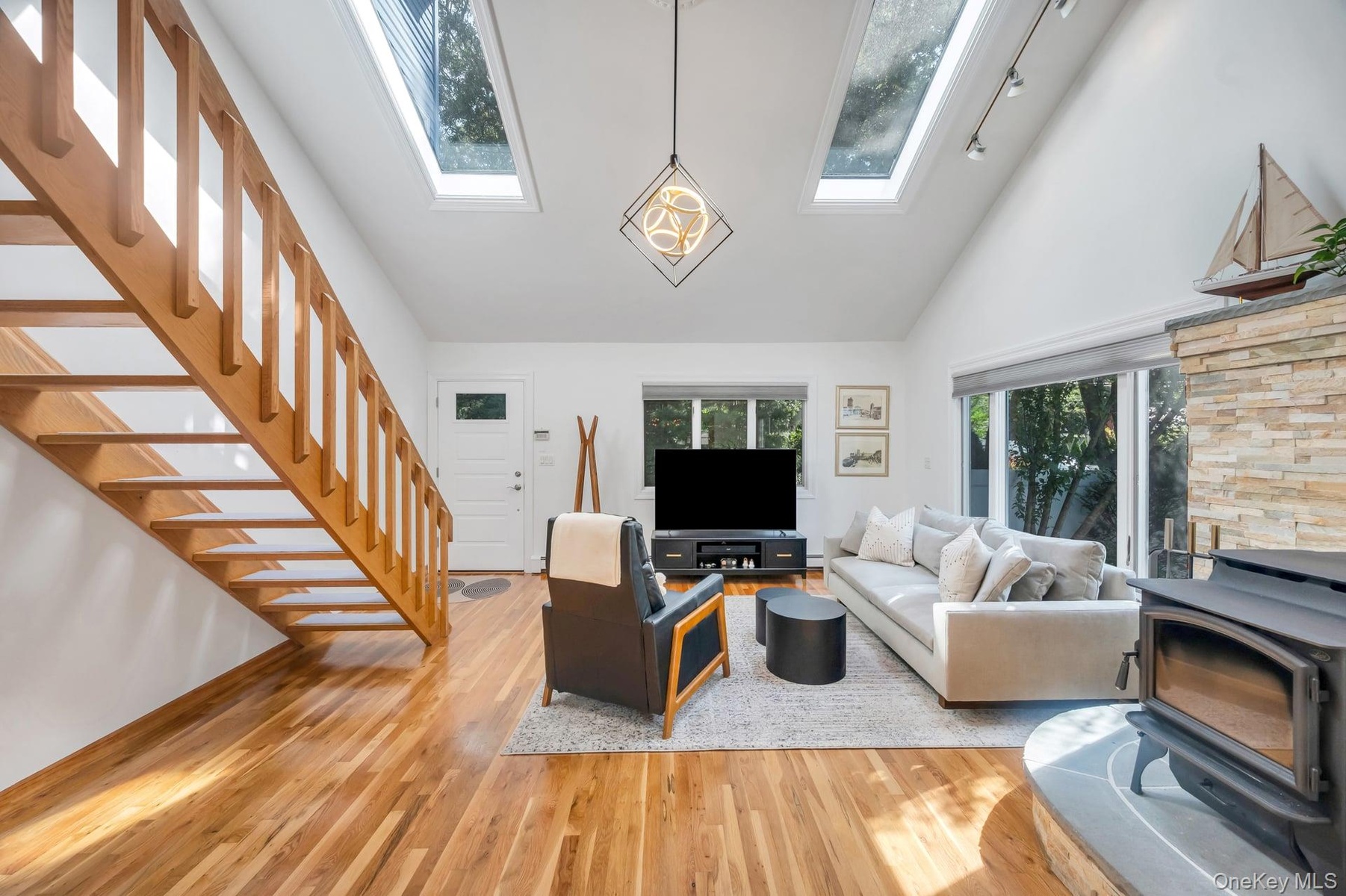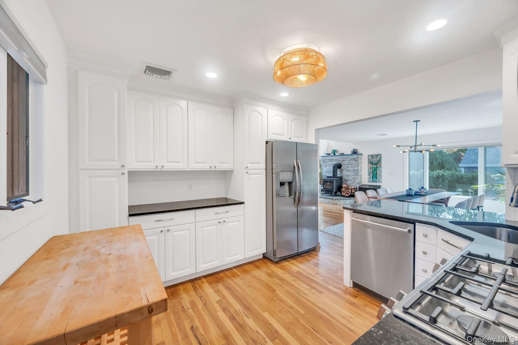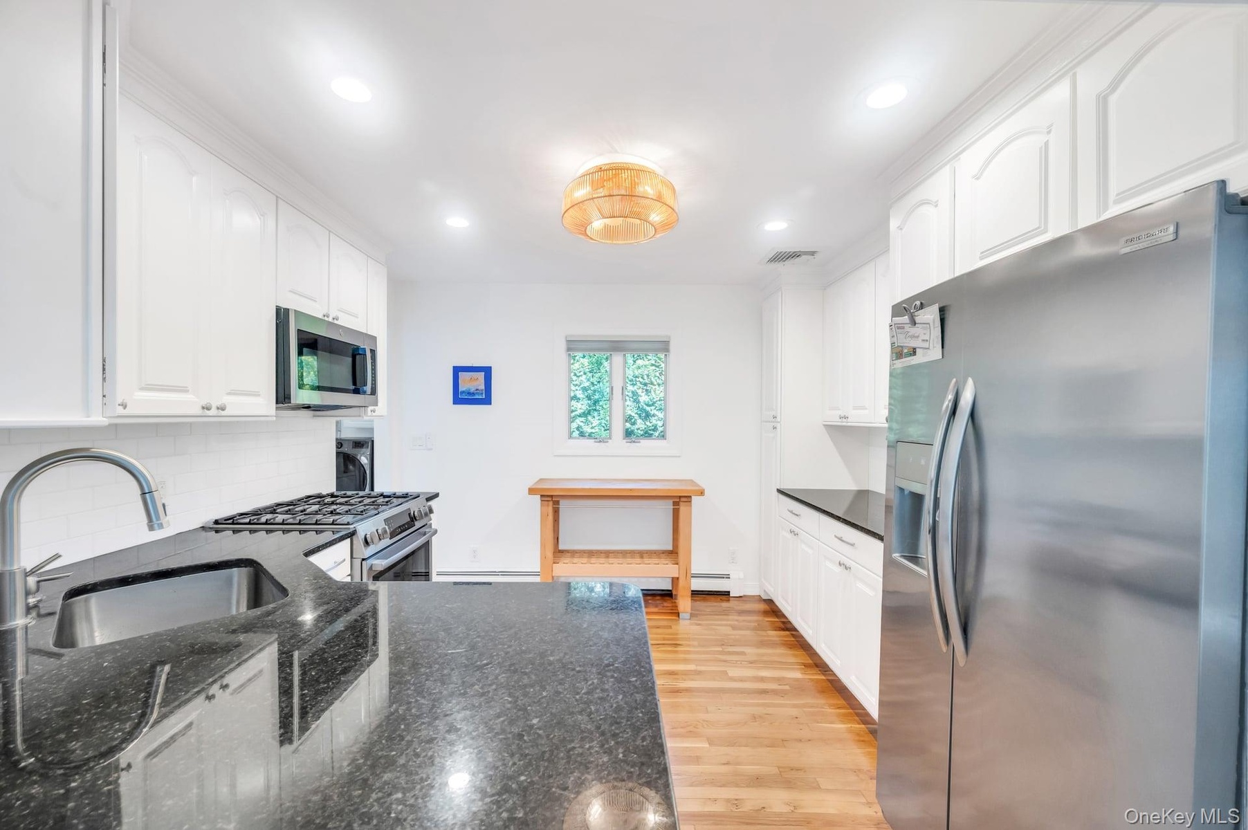 Incredible opportunity to own a magnificent newer-built home boasting a two-year-old roof, setback on the property with mature landscaping that creates privacy and seclusion from the moment you arrive. A long blacktop driveway with a Belgian block border leads to a two-car detached garage with electric, one large garage door, and white PVC fencing framing the grounds. The front approach is highlighted by a custom paver porch and beautiful cultured stone skirt wrapping the home, setting the tone for what’s inside and out. The backyard is a true resort, featuring an enormous paver patio, heated saltwater inground pool, multiple entertaining spaces, a portion of the yard finished with Astroturf for low-maintenance beauty while the front yard remains lush grass, and several entrances into the home for seamless indoor-outdoor living. The pool is perfectly positioned between the house and garage, creating a tranquil, private oasis. Inside, a brand-new white front door with glass top opens into a dramatic two-story grand entry with soaring vaulted ceilings, recessed lighting, and oversized windows that fill the space with natural light. The formal living room is centered around a one-year-old Lopi Endeavor wood-burning stove set against a cultured stone wall, while the formal dining room is highlighted by a modern nine-bulb chandelier and a huge slider leading directly to the rear yard. The chef’s kitchen is outfitted with white cabinetry, granite countertops, stainless steel Bosch stove and dishwasher, stainless steel refrigerator with water and ice, subway tile backsplash, and a breakfast bar, all flowing seamlessly into a brand-new mudroom complete with LG front-loading washer and dryer, white cabinetry, hanging storage, and yet another access point to the backyard. The first floor offers one bedroom, making it ideal for a home office, out-of-town guests, or extended family, along with a full bath featuring floor-to-ceiling tile, a glass stand-up shower, and modern fixtures. Upstairs you’ll find a versatile den/bonus room or additional bedroom with updated hardwood floors and ceiling fan, plus an incredible primary suite with ceiling fan and a brand-new spa-like bath with glass tub and shower with built-in soap niches, custom tile flooring, and white vanity. A spacious additional bedroom with new flooring and a six-panel fog glass closet door rounds out the second floor. This home is packed with upgrades including 200-amp electrical service, Andersen windows, a less than one-year-old high-efficiency boiler, propane cooking, a separate cesspool and dry well, and a five-zone inground sprinkler system. Truly one-of-a-kind, this property combines modern finishes, meticulous updates, resort-style outdoor living, and every high-end feature today’s buyer could want.