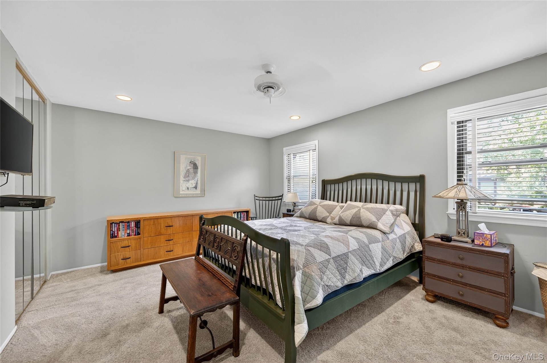 - Bedroom featuring light colored carpet, ceiling fan, and recessed lighting